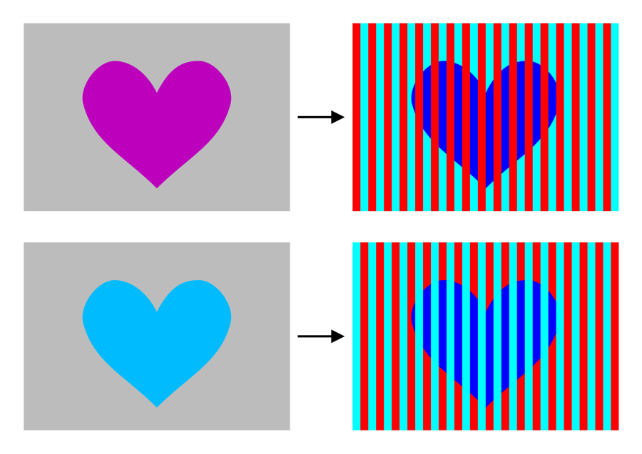 マゼンタ色とオレンジ色の渦巻きがあるように見えるが、同じ赤である。