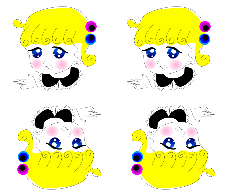 本研究課題において、研究代表者とその研究協力者が発見あるいは明らかにした顔の錯視として、「顔ガクガク錯視」(wobbling face illusion)がある。これは、目と口を上下方向にコピー&ペーストして4つ目・2つの口の顔画像を作ると、顔の知覚が不安定に見えるという現象である(Ueda, Kitaoka and Suga, 2011)(図1)。この現象については、「二重顔錯視」(double face illusion)という名称で別のグループから続報も出た(Hancock and Foster, 2012)。顔倒立効果に関する顔の錯視の1つとして、「さかさま顔の過大視」錯視が知られていたが(北岡, 2010)が、横にした顔を含めて比較したところ、実は正立顔が過小視されているのであったという逆転の結果を得た(Araragi, Aotani and Kitaoka, 2012)(図2)。そのほか、視線方向の錯視として、アイシャドーの錯視を発見した(北岡, 2012a)。アイシャドーを付けた側と反対方向に視線が変位して見えるという錯視である(図3)。肌より明るいアイシャドーの場合は、アイシャドーを付けた側と同方向に視線が変位して見える。左右の視線方向にも効果があり、例えば斜視の美容に応用できる可能性がある。