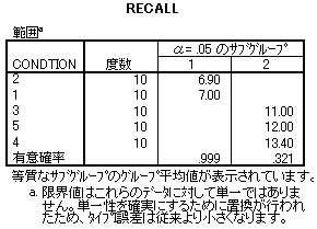 再生量について 5つの学習条件を比較した実験を想定して作成されたデータ (Howell , 2002, pp. 320-321) の平均値を比較します。