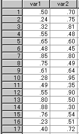 - var1 と var2 の平均値と,定数 (例えば,0.5) との差が統計的に有意かどうかについて t 検定を行います。