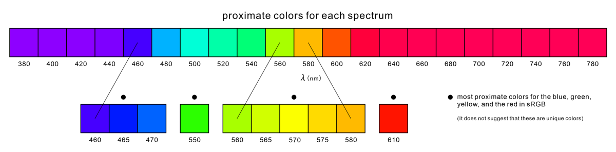 | sRGB red | 610 | 1.0026 | 0.5030 | 0.0003 | 0.666 | 0.334 | 255 | 20 | 0 |