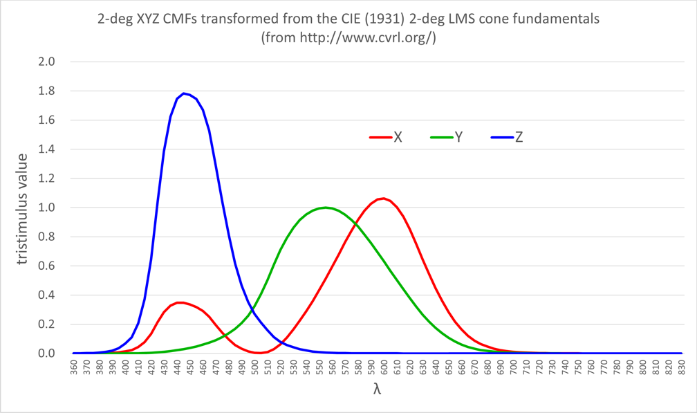 Based upon "2-deg XYZ CMFs transformed from the CIE (1931) 2-deg LMS cone fundamentals" (http://www.cvrl.org/)