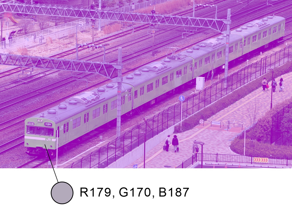 電車は青く見えるが、画素の色相は黄色である。