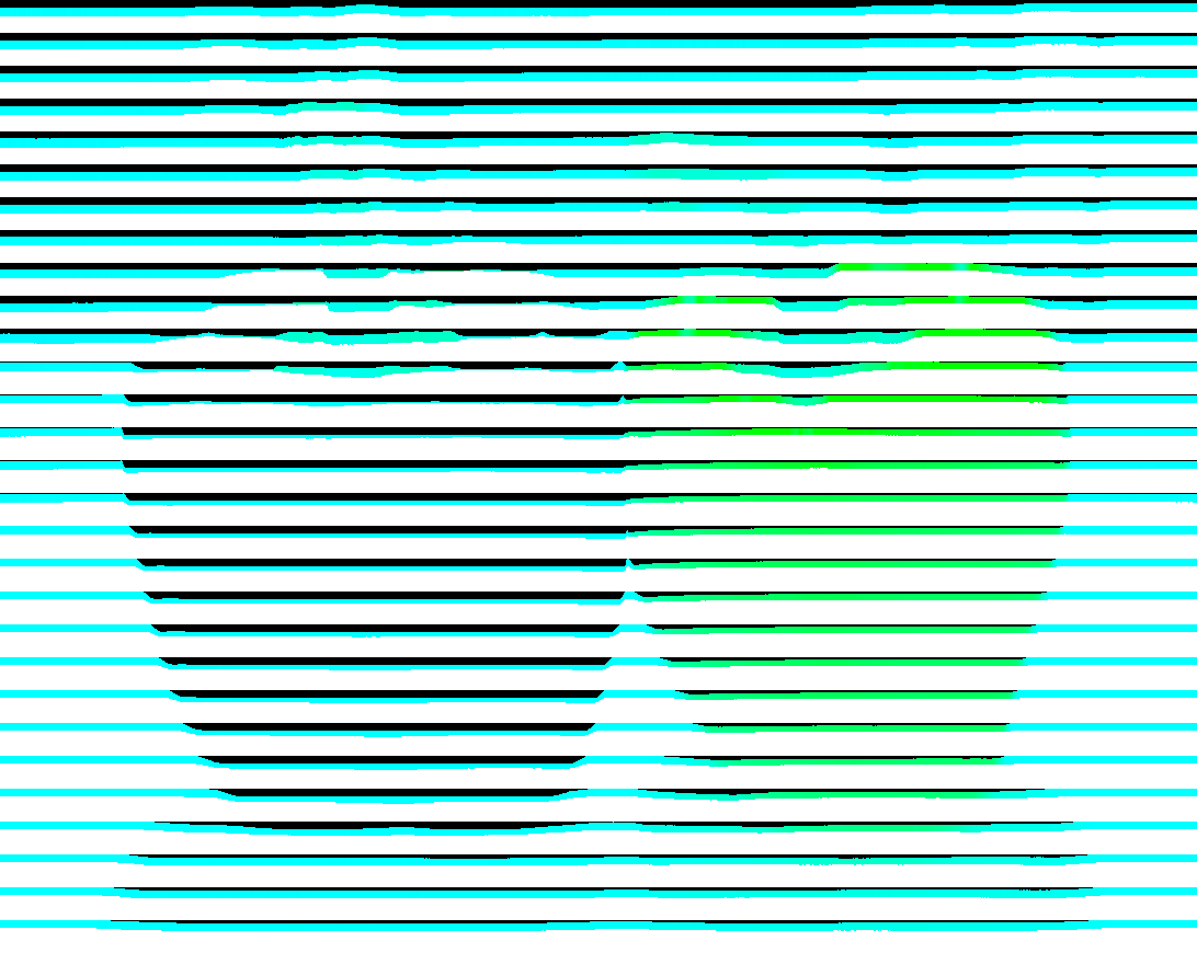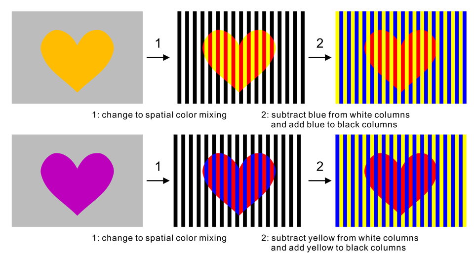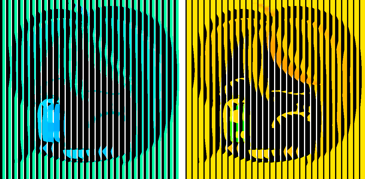 どちらも同じ黒と白の縞模様であるが、左の顔は赤く見え、右の顔は青く見える。