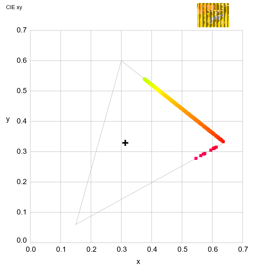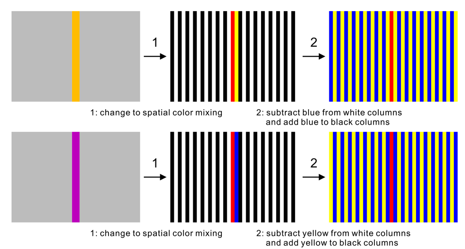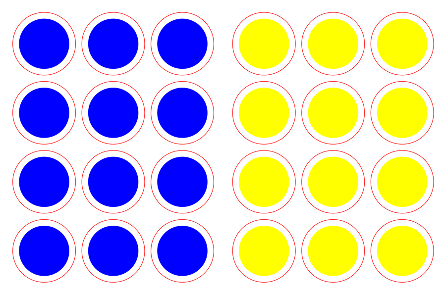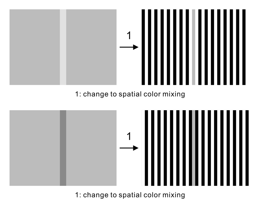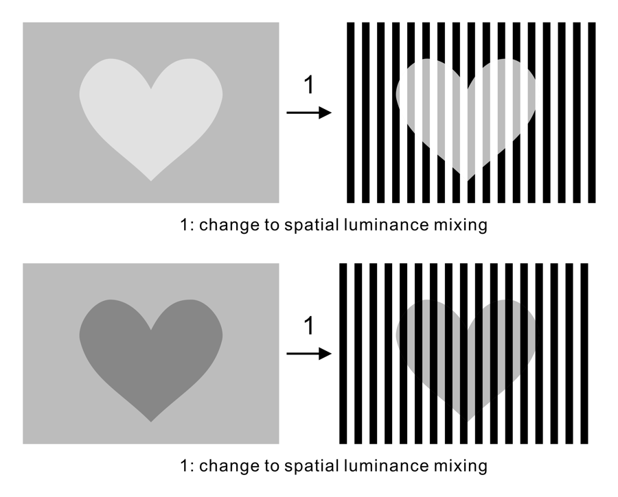 赤い円はすべて同じ色であるが、左半分のものはオレンジ色がかって見え、右半分のものはマゼンタ色がかって見える。要するに、現象としては色の対比となる。ターゲットが誘導領域と接している必要はない、というのがキルシュマンの第2法則である。この現象の説明に側抑制説は適用できない。