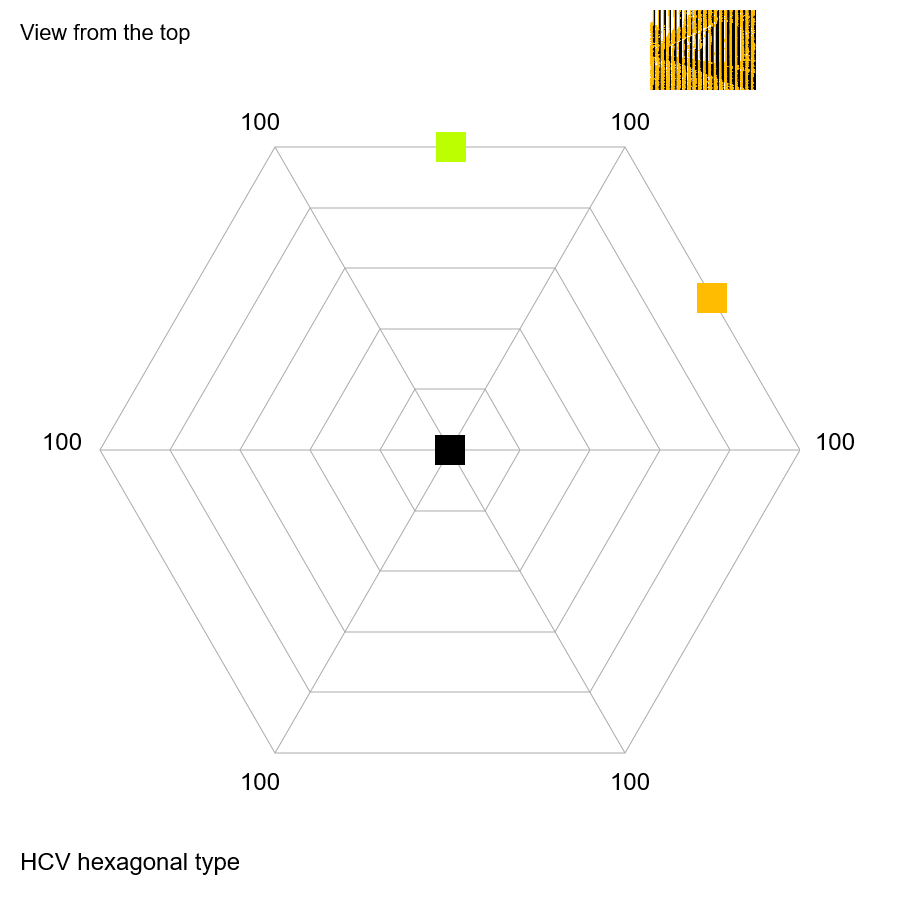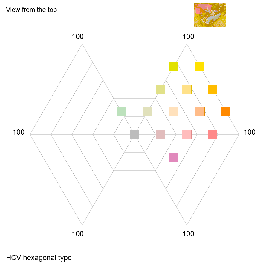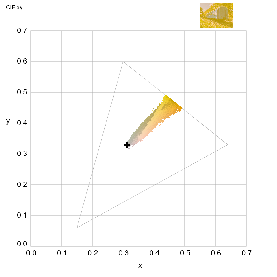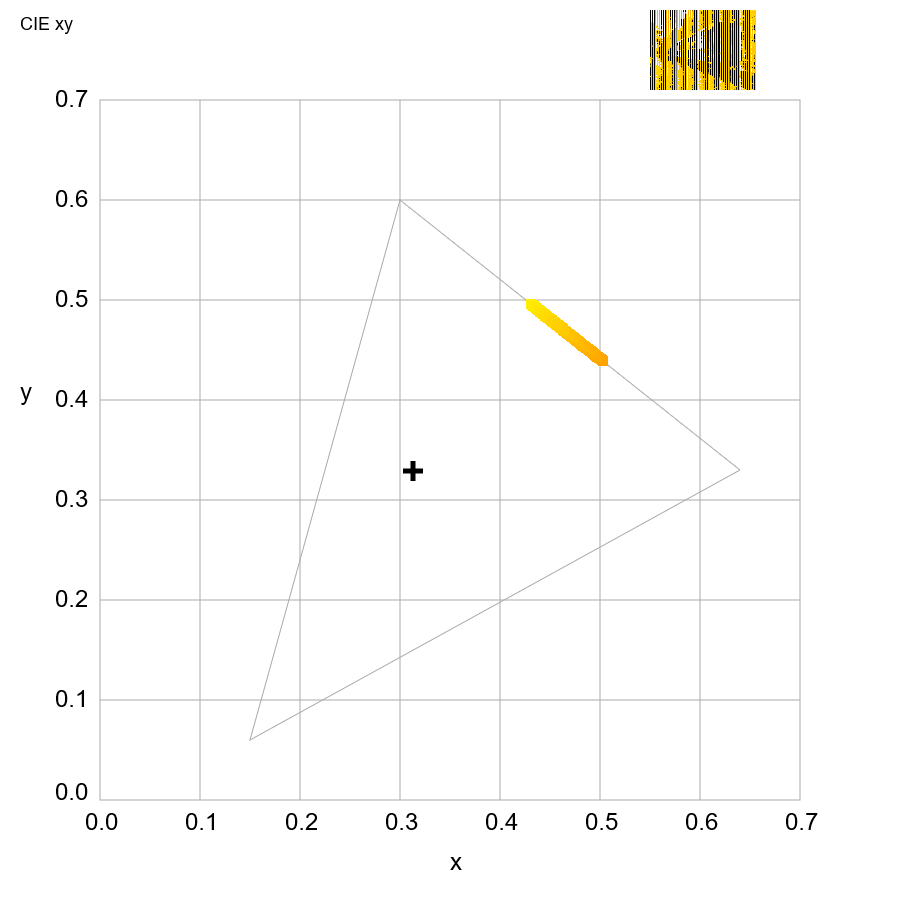 赤い円はすべて同じ色であるが、左半分のものはオレンジ色がかって見え、右半分のものはマゼンタ色がかって見える。要するに、現象としては色の対比となる。ターゲットが誘導領域と接している必要はない、というのがキルシュマンの第2法則である。この現象の説明に側抑制説は適用できない。