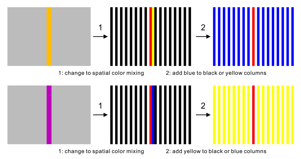上の顔は白い目と黒い目、中段左の顔は白い目と暗い黄色の目、中段右の顔は淡い青の目と黒い目、下の顔は淡い青の目と暗い黄色の目に見えるが、白い目と淡い青の目は同じ色で、黒い目と暗い黄色の目は同じ色であるから、目の画素の色だけを言えば共通しているのである。左の画像の白く見える目の色は右の画像の青く見える目の色と同じで、左の画像の黄色に見える目の色は右の画像の黒く見える目の色と同じである。