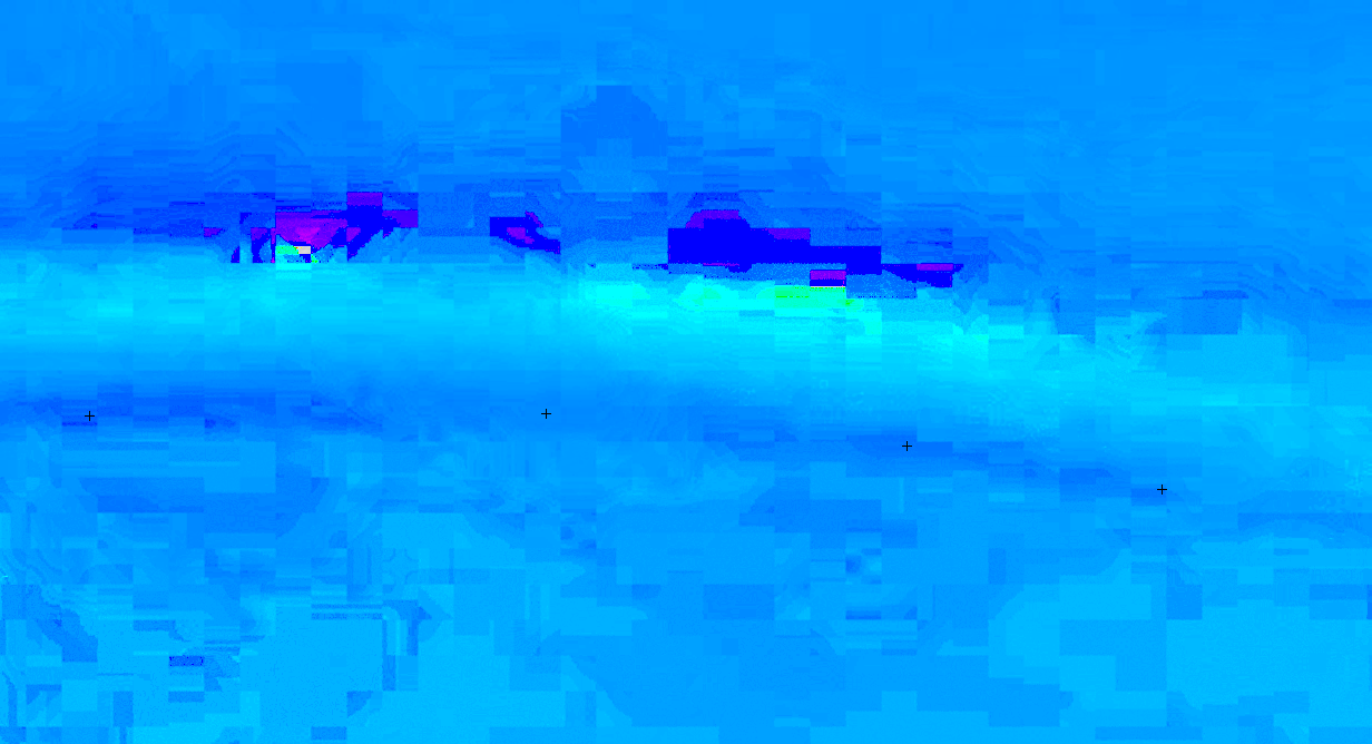 この写真の+の箇所は紫色に見えるが、画素の色相は青色である。