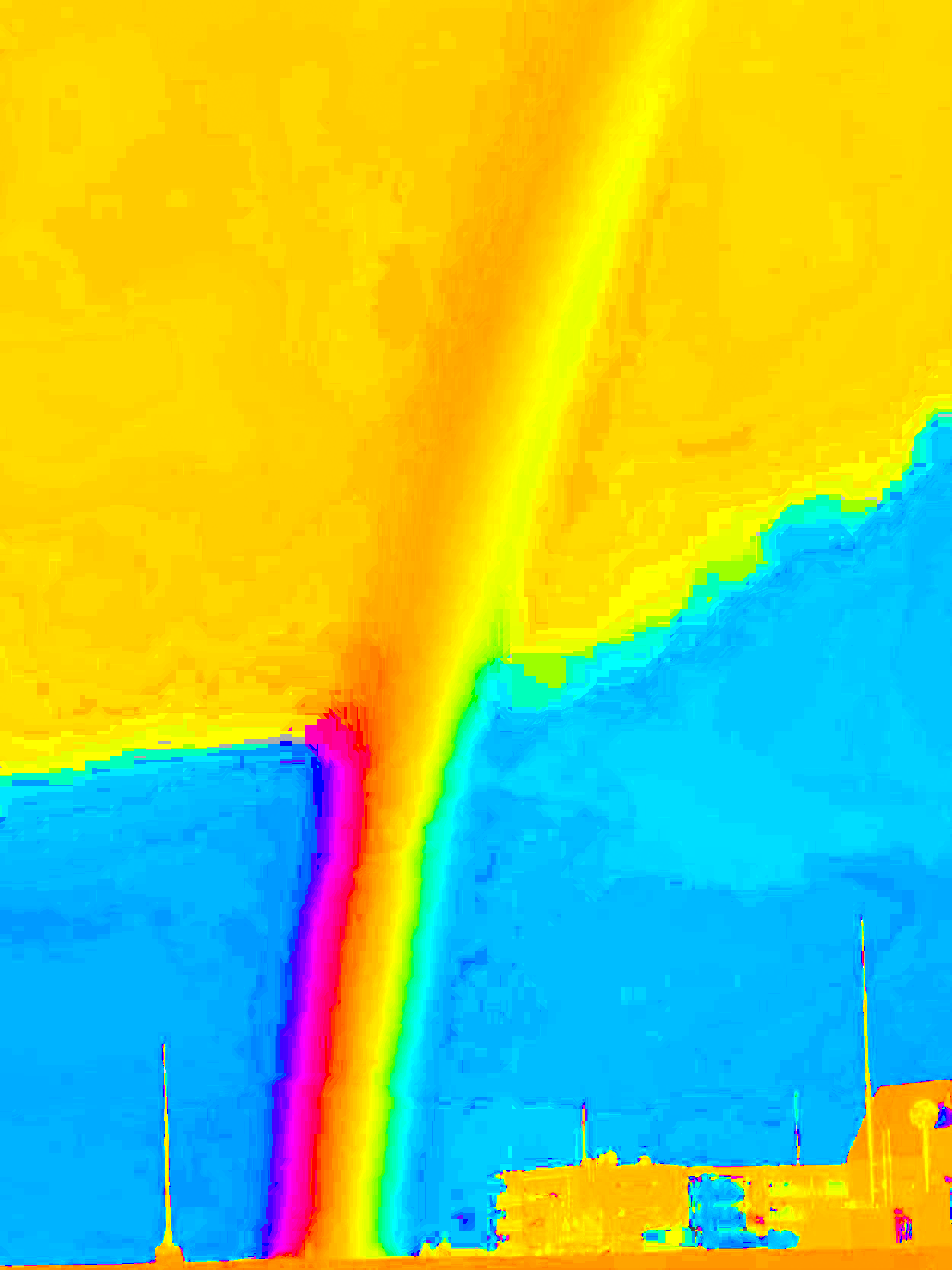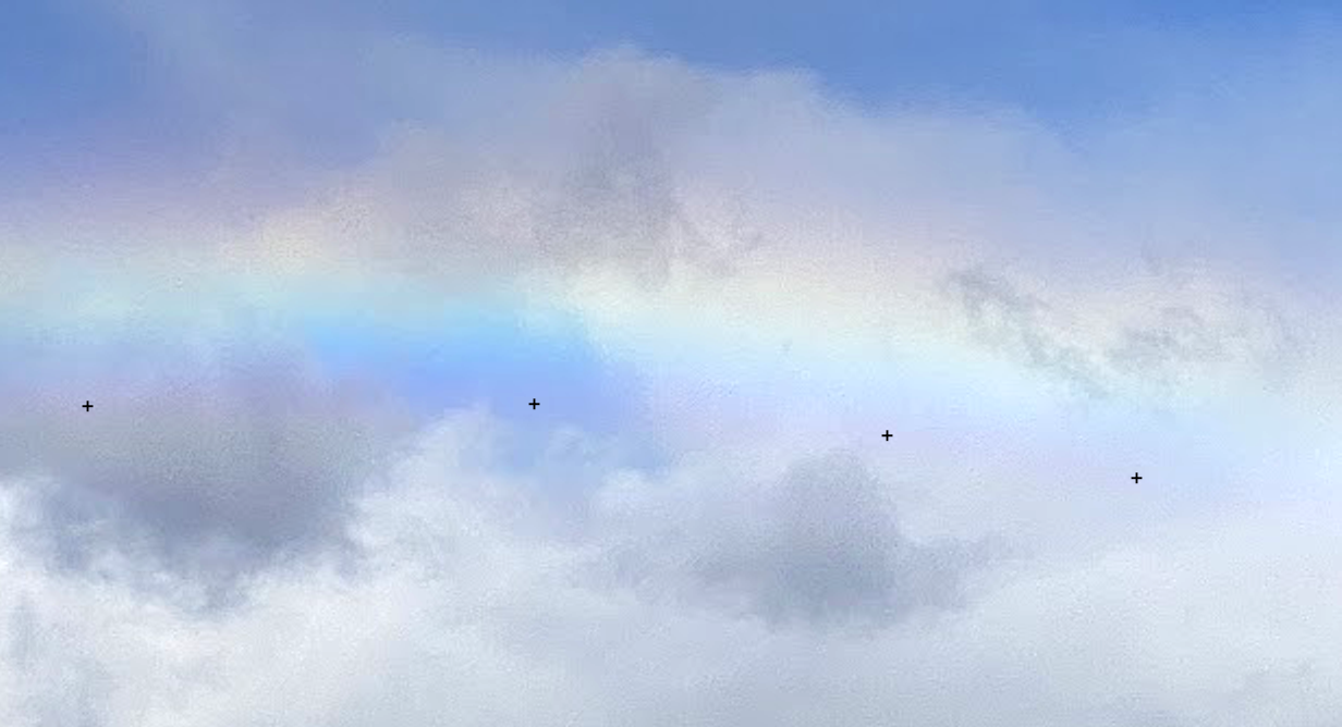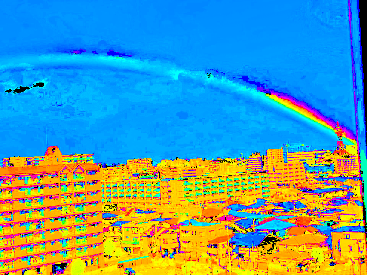 この写真の雲を背景とした虹の青や紫に見える部分は画素の色相は黄緑色か橙色である。