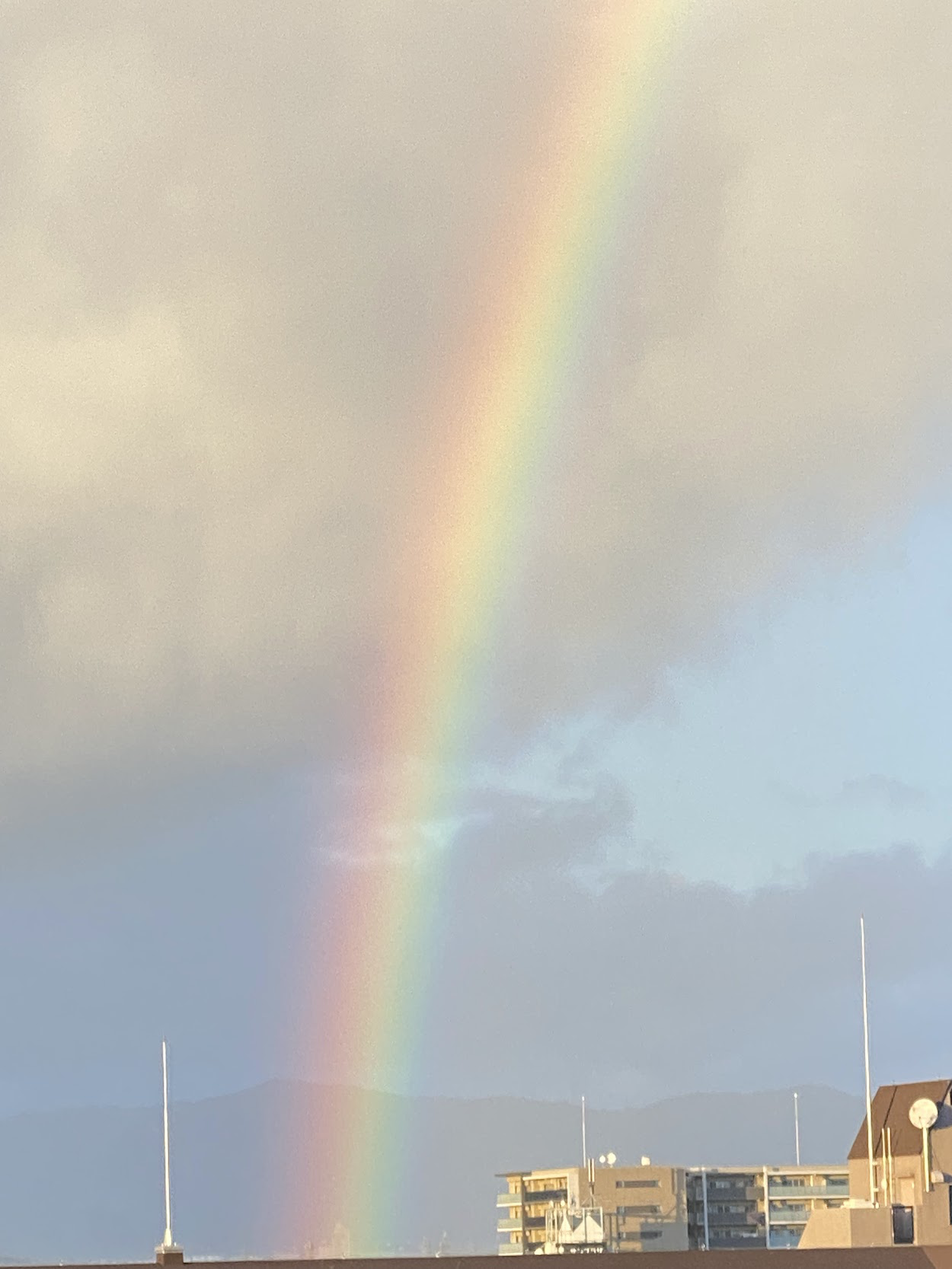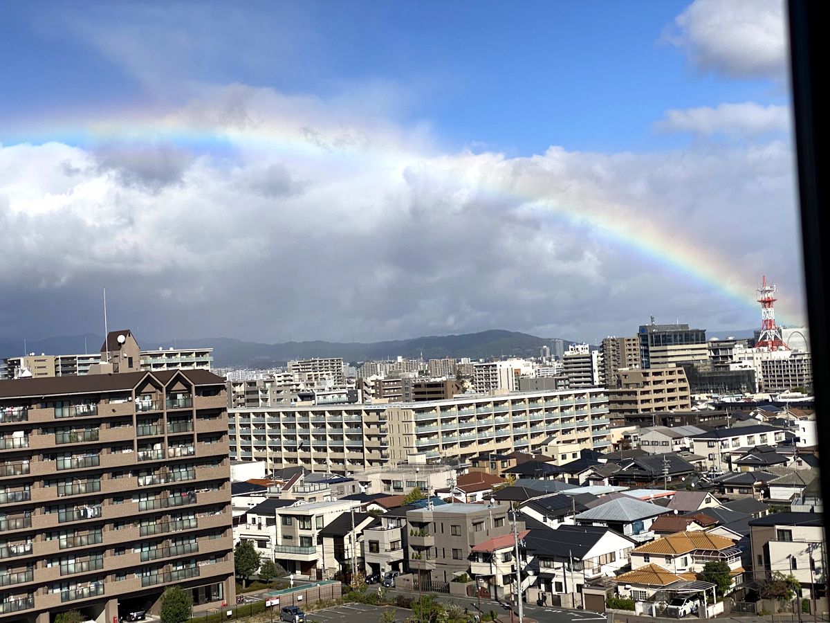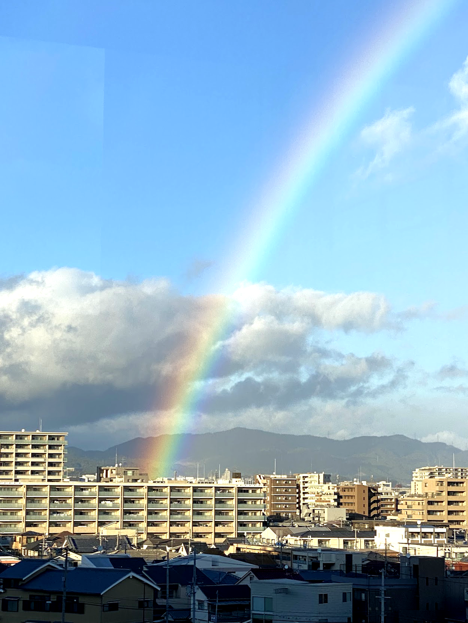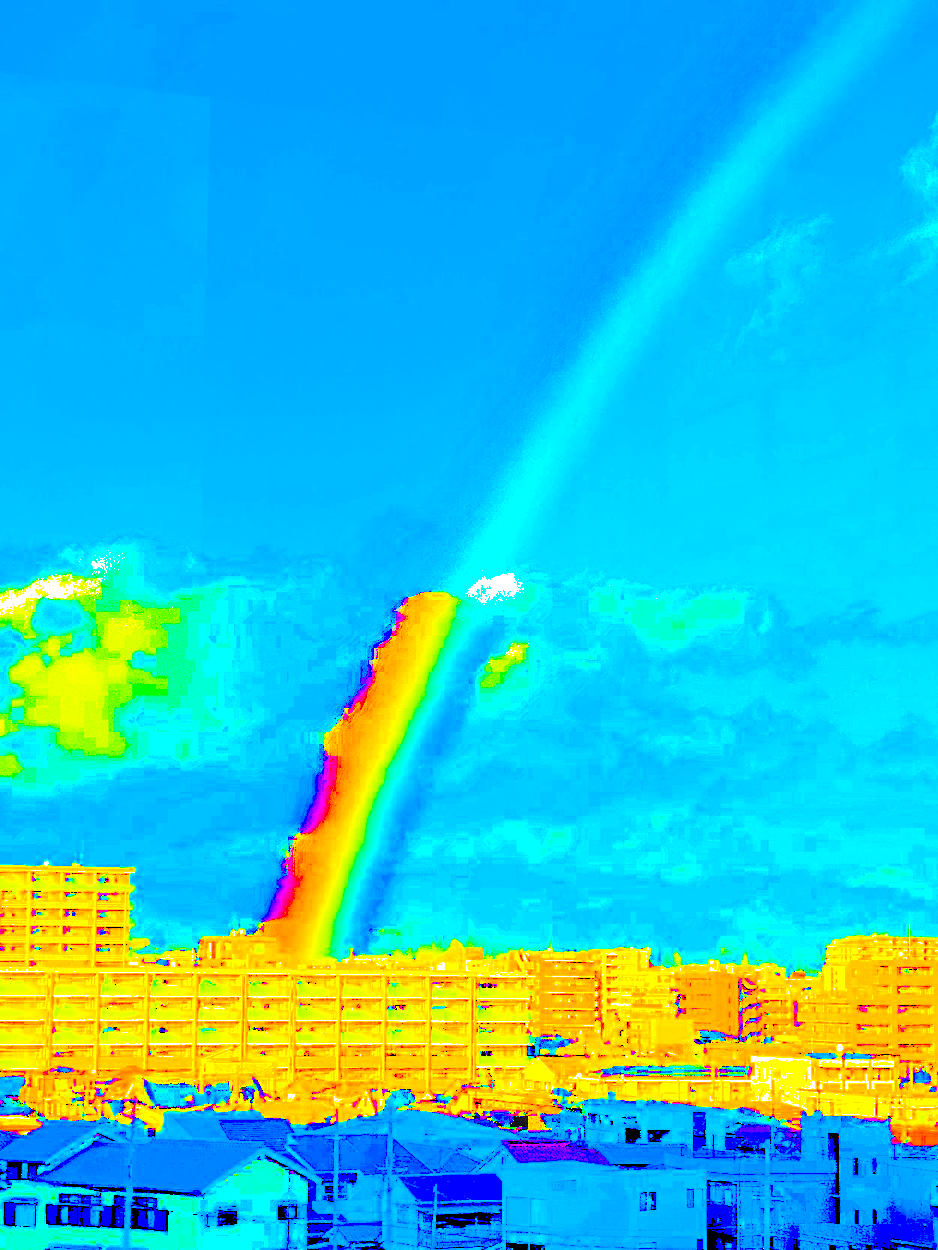 この写真の青空を背景とした虹の赤く見える部分は画素の色相は水色である。