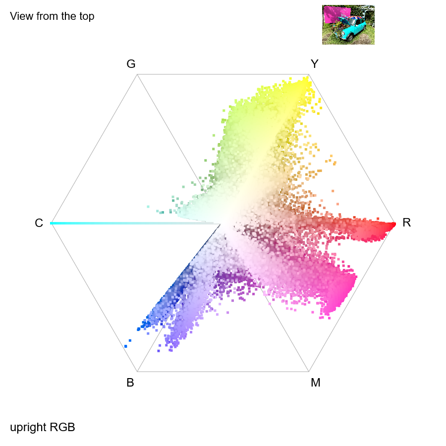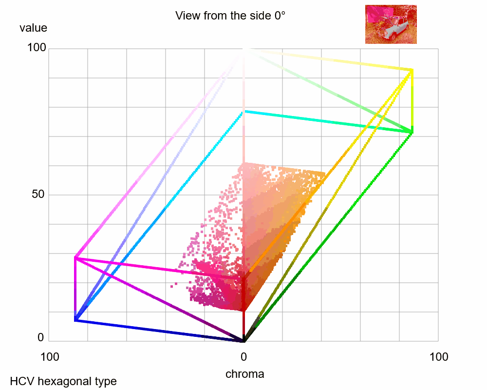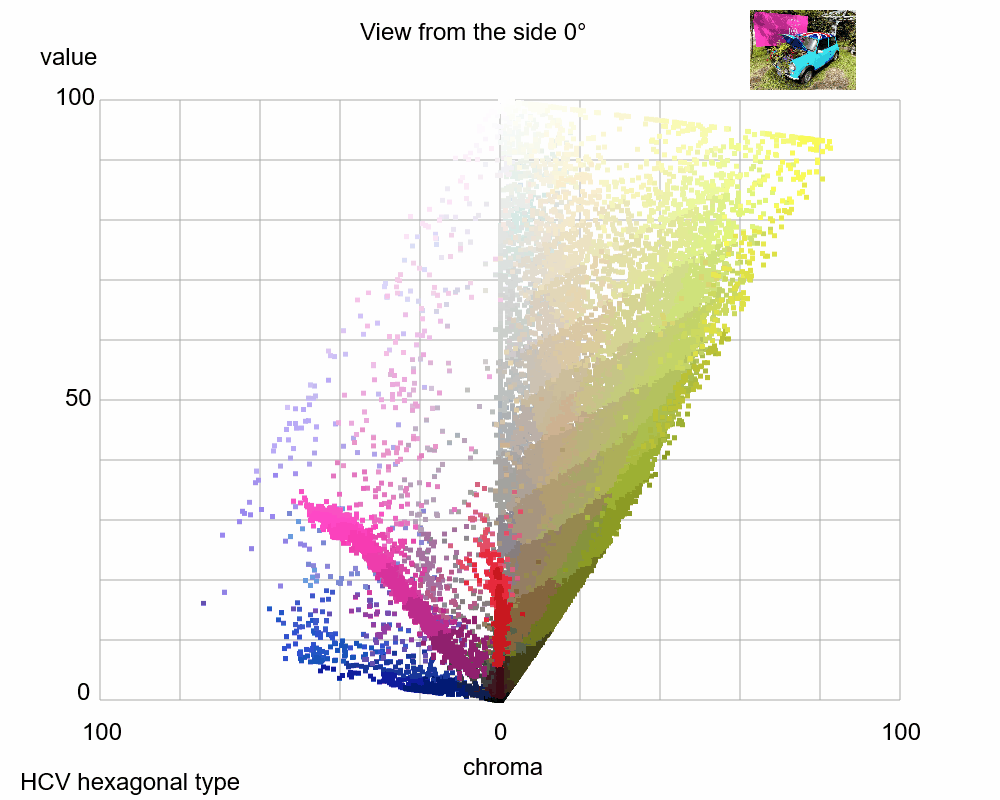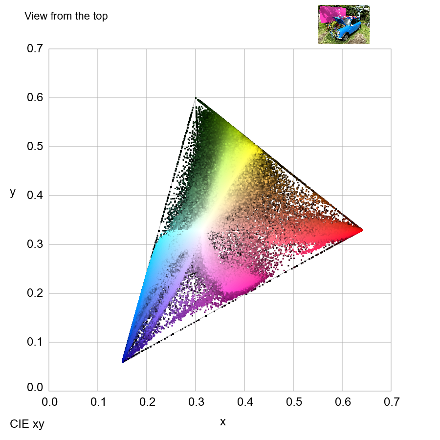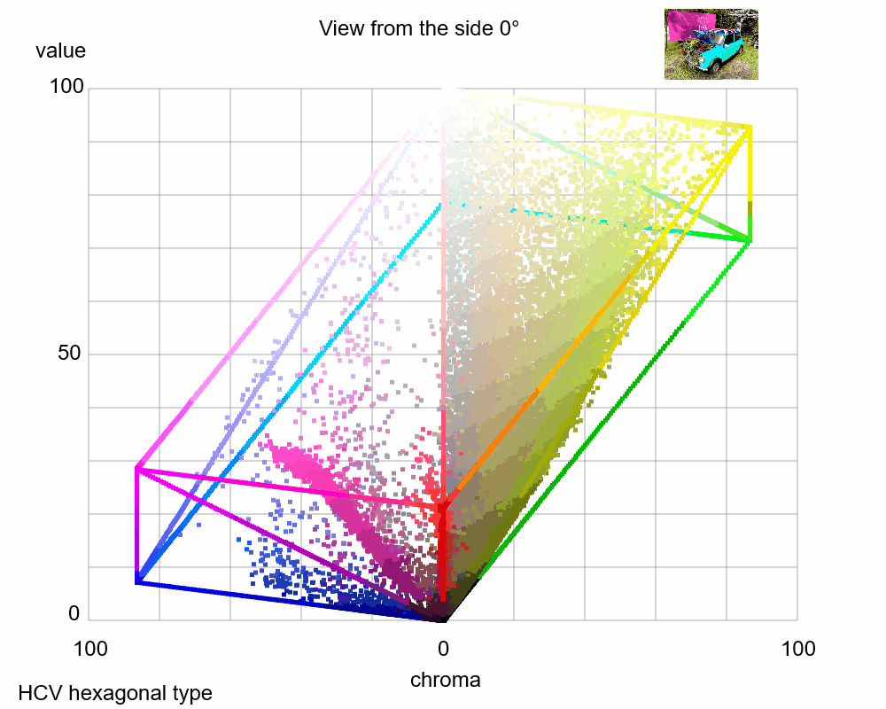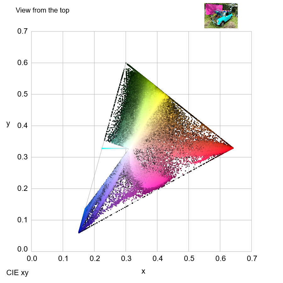 sRGBの枠を取ったものです。シアン色の三角形的な分布は、車体の色の分布です。これが加算的色変換によって、回転軸(無彩色の色の分布)に突き出した灰色の三角形に変換されるわけです。