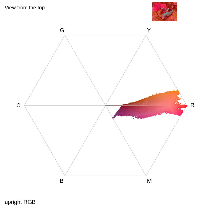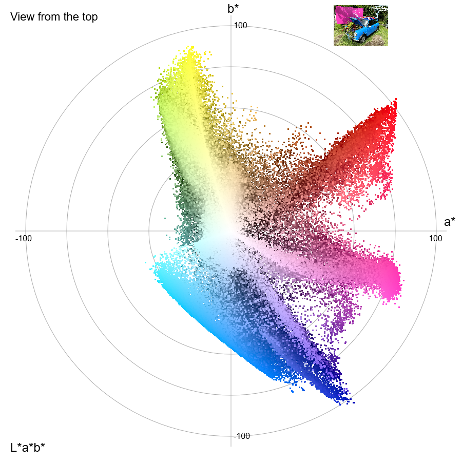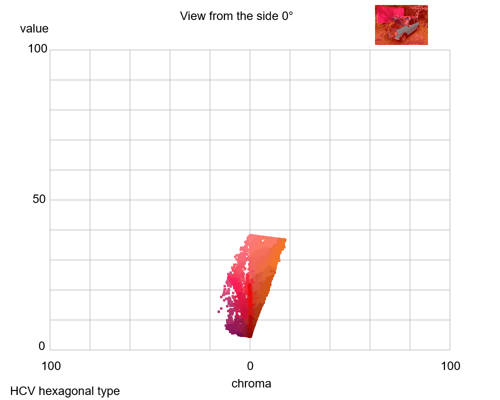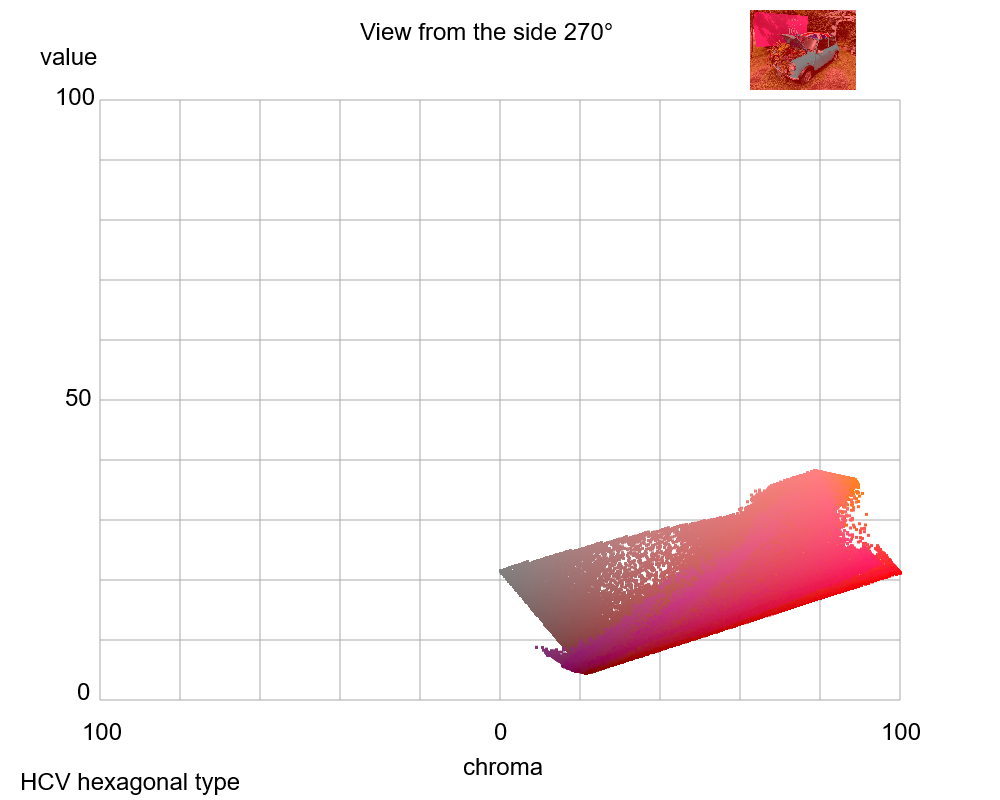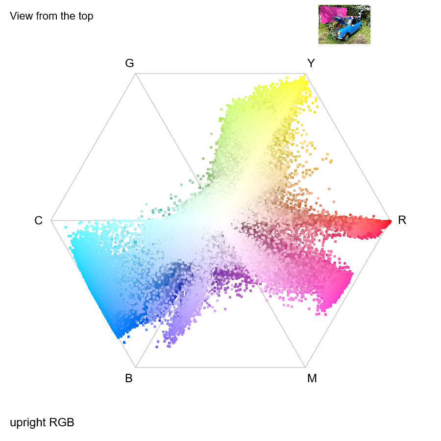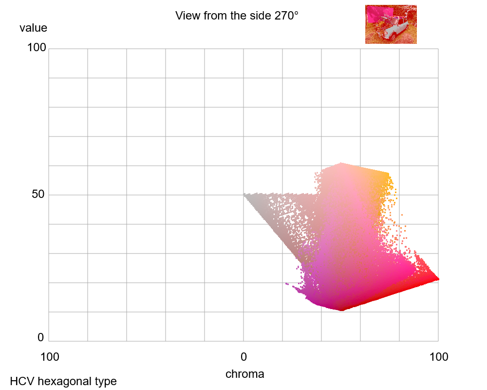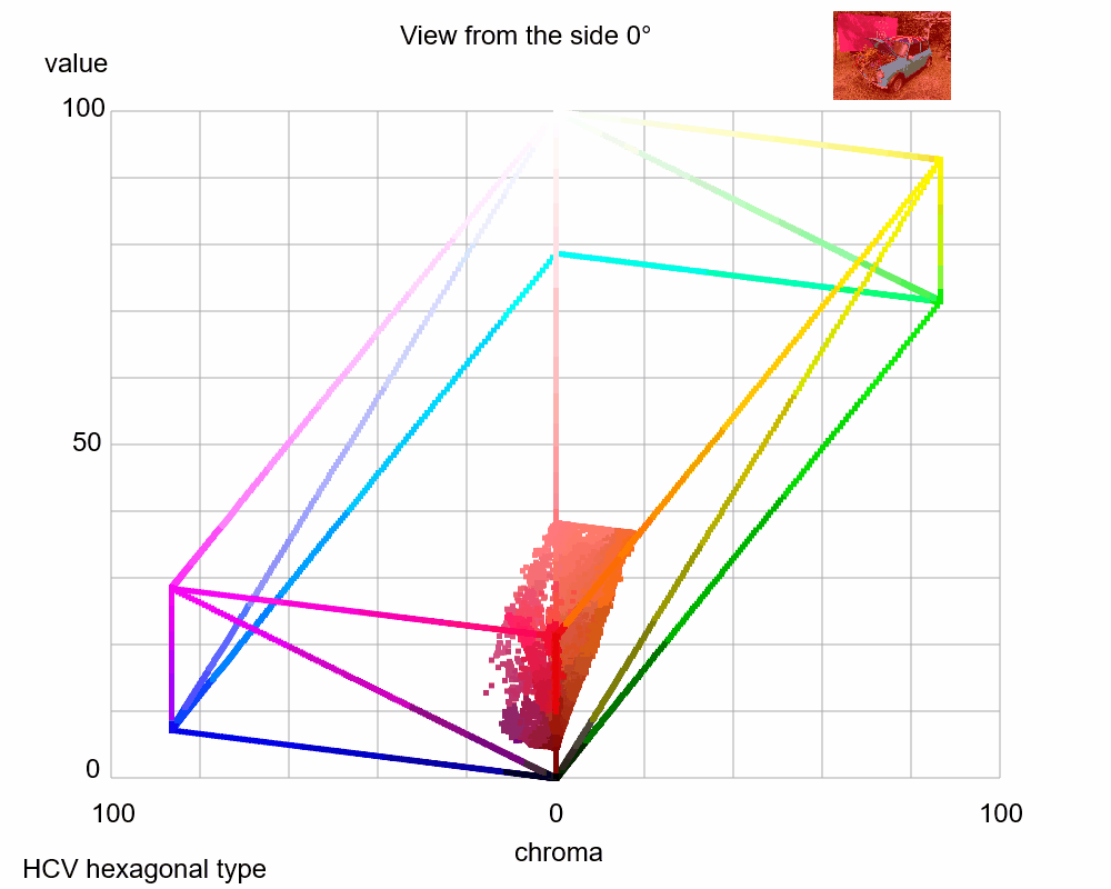 sRGBの枠を取ったものです。シアン色の三角形的な分布は、車体の色の分布です。これが加算的色変換によって、回転軸(無彩色の色の分布)に突き出した灰色の三角形に変換されるわけです。