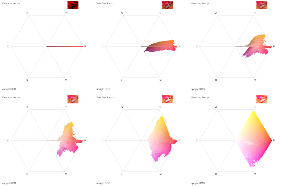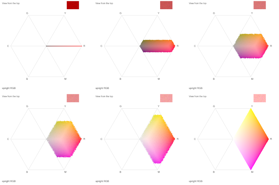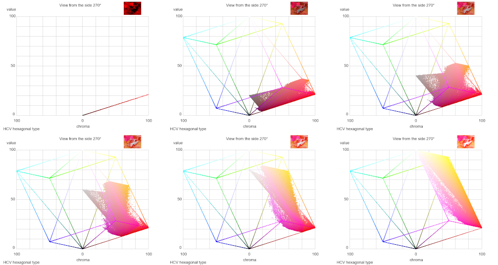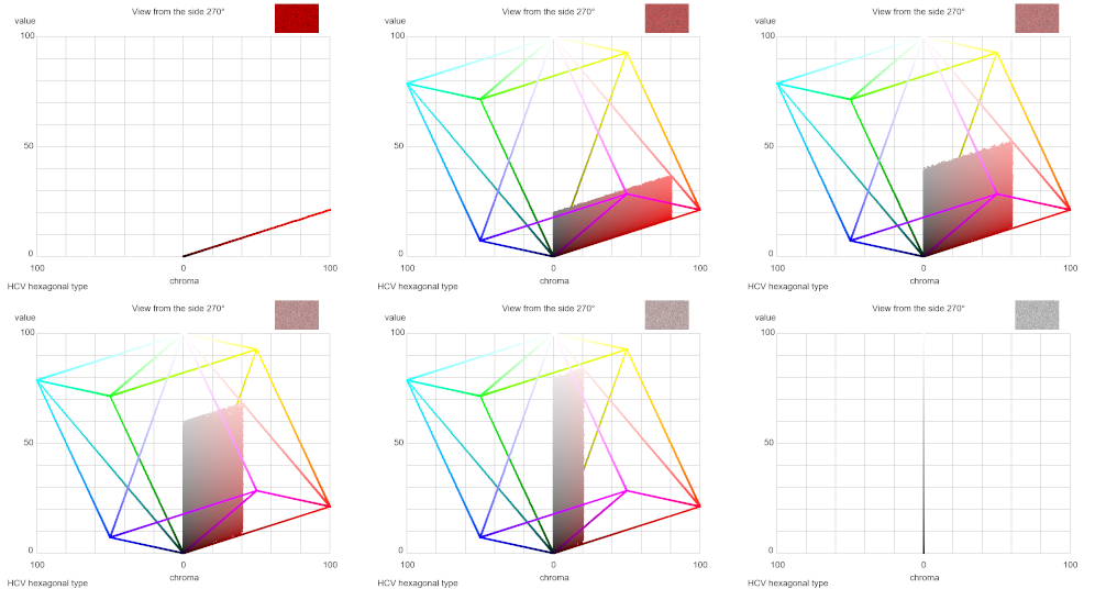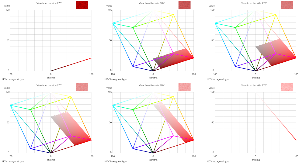 横(南)から赤・シアン色相面を垂直に見た時の色の分布です。左上から右に β = 0.0, 0.2, 0.4、右下から右に β = 0.6, 0.8, 1.0 なので、色の分布の塊は平行四辺形で(左上と右下は線分であるが、厚みのない四辺形と考えると連続です)、その塊が垂直軸に接している角の輝度値と β 値 は一致することがわかります。