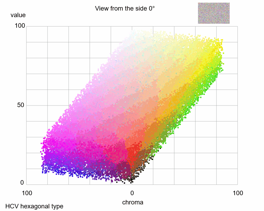 色度図は明るさ軸と平行な方向から(上から)見た図なので、横から見た図にしてみます。色度図における南側から(下から)見た図がこちらです。縦軸は、sRGBで定義する輝度(× 100)です。青く見える車体の画素はほぼ灰色で、中央の縦線のところに突き出している角のあたりです。白く見えるところ(知覚的な白色点)は右寄りにある一番上の角です。一方、黒く見えるところは、左寄りにある一番下の出っ張りです。