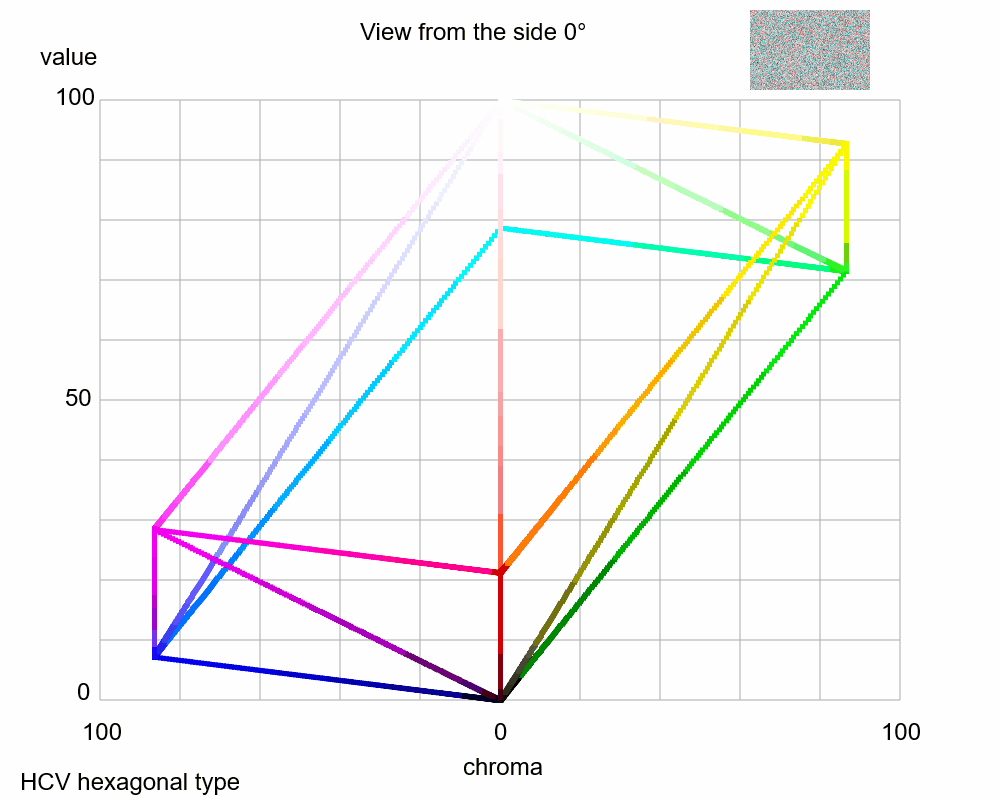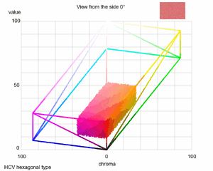この色空間においてsRGBの占める範囲を知らないとピンとこないと思いますので、参考までに小さく再掲します。この色空間(北岡製hHCV。リニアRGB空間を白黒軸で直立させて、白黒軸を輝度軸に置き換えたもの)におけるsRGBの色立体はこちらです。