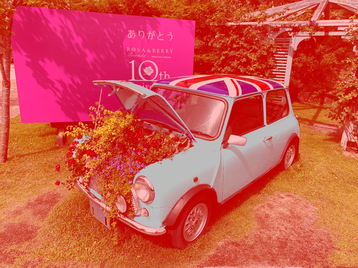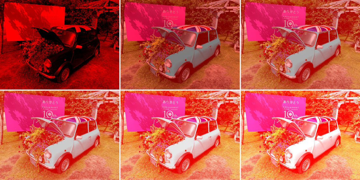 さて、上記アルファブレンディングによる色変換画像は、α = 0.5 ですが、その0.5の値としては階調値(0から255)の真ん中128を選んでいいますし、計算も階調値をそのまま用いています。これを輝度の0.5を選択し、計算も輝度値(0.0から1.0)を用いて加算的色変換を行うと、この図が得られます。車体は水色に見えますが、画素は灰色か赤の色相です。錯視図としては私は上記の図の方が好みですが、この錯視の説明の都合上、こちら(輝度ベースの加算的色変換)で説明していきます。