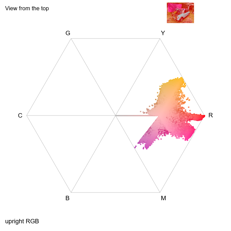 縦軸(輝度軸)の周りに回転させてみたら、形状がわかりやすいかもしれません。作成の手間の都合上、16分の1に縮小した画像の色分布を用いています。