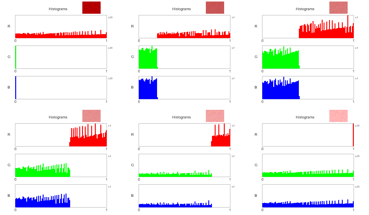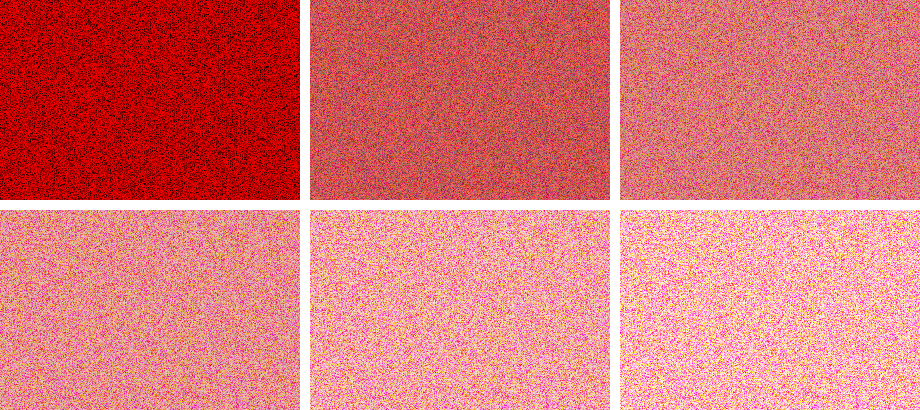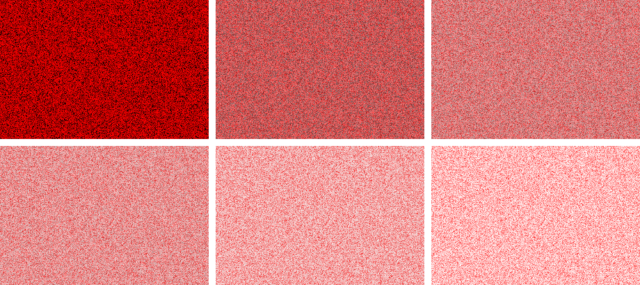 上記のランダムカラードットと赤一色を β = 0.0, 0.2, 0.4, 0.6, 0.8, 1.0 で加算的色変換を行います。下図が得られます。左上から右に β = 0.0, 0.2, 0.4、右下から右に β = 0.6, 0.8, 1.0 です。