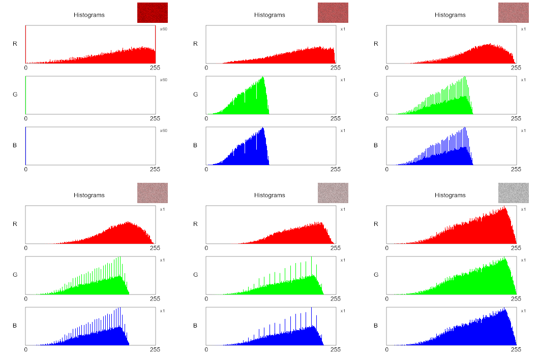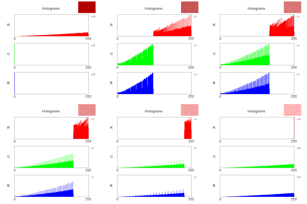 こちらは、RGBサブピクセルの階調値のヒストグラムです(0から255)。Rの値はGやCの値よりも大きいか同じであることがわかります。これによって、シアン色の色相の画素はないことがわかります。このヒストグラムを作成するプログラムは、こちらです。各ヒストグラムにおいて、Rの値が一番小さいところはCとGの値が一番大きいところでもありますが、上記の β に対応します。β は 0.0, 0.2, 0.4, 0.6, 0.8, 1.0 と 0.2 刻みの等間隔に設定しましたが、階調値換算ではそれぞれ 0, 124, 170, 203, 231, 255 となりますので、一見等間隔ではありませんが、これで合っています。