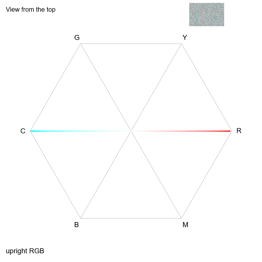 横から見た時の分布をわかりやすく見るために、ランダムカラードットを赤・シアン色軸の2色に変換します。