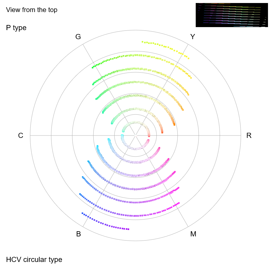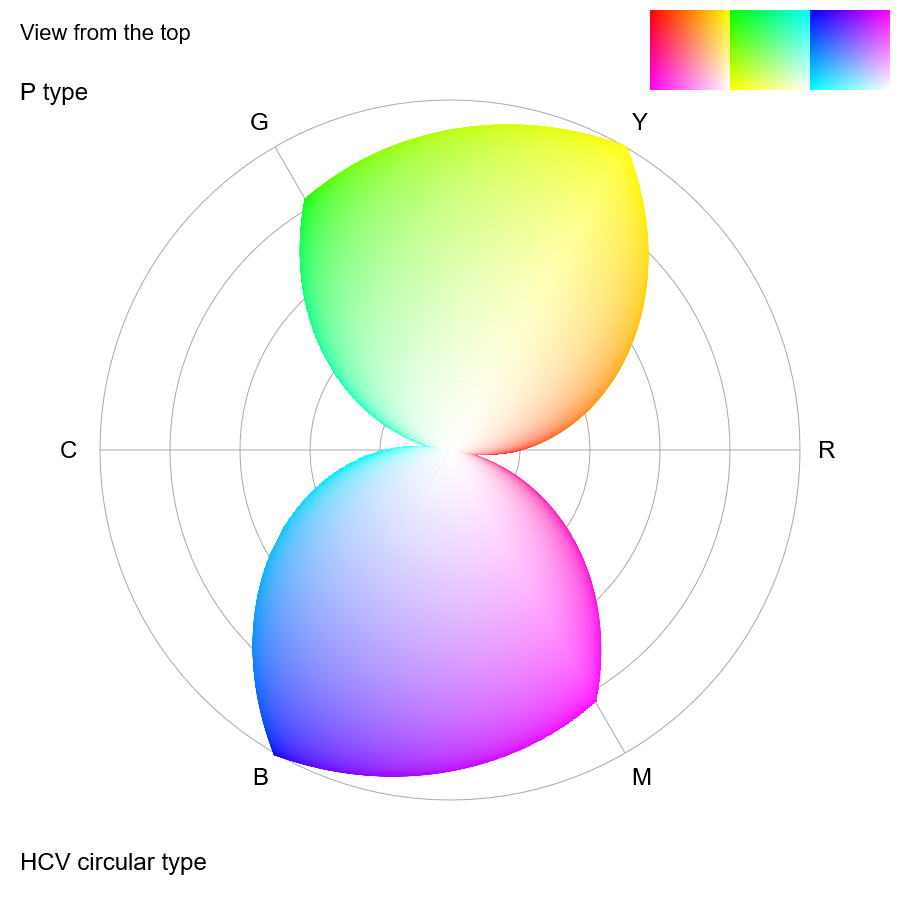 Confusion colors of P type plotted in the chroma map for P type