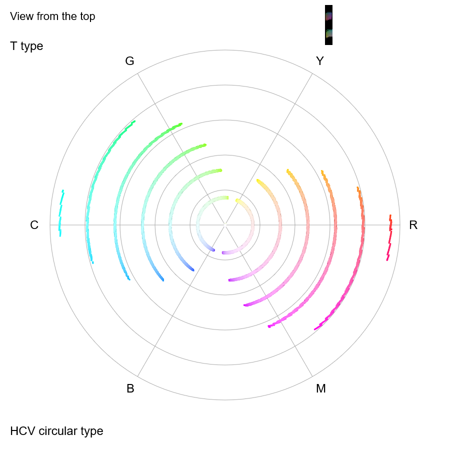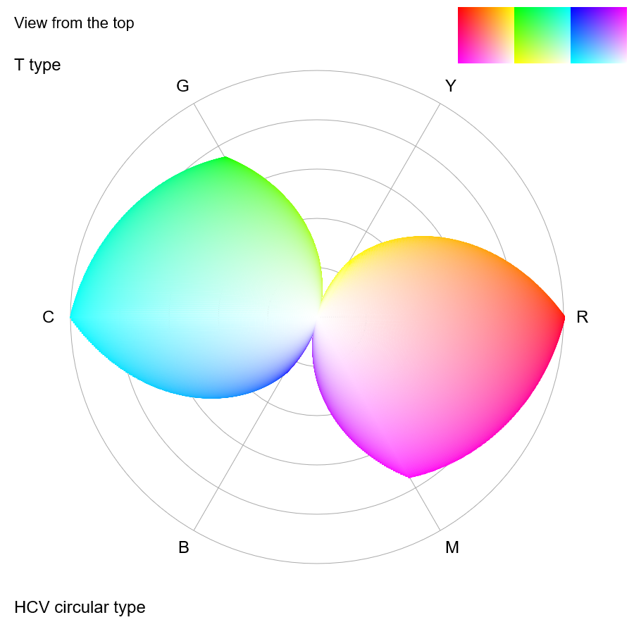 Confusion colors of T type plotted on the chroma map for P type
