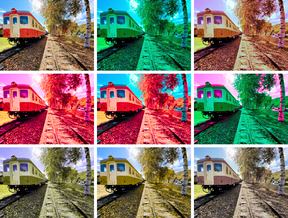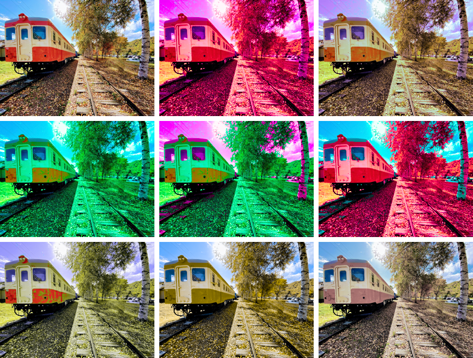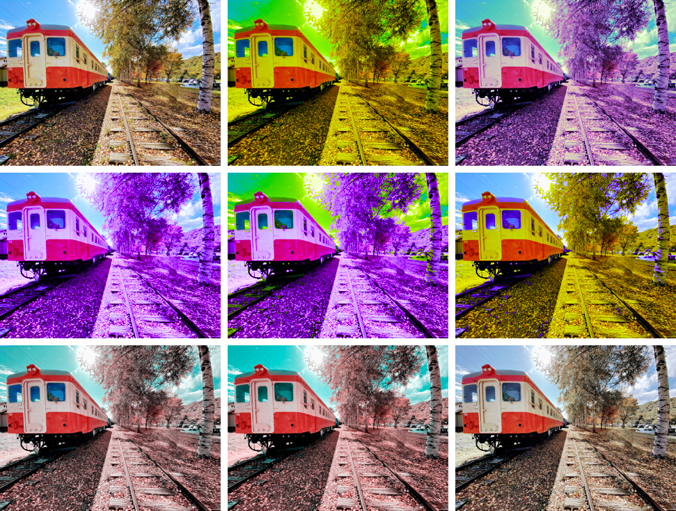 T型の混同色画像。上段左はオリジナル画像。上段中央は、S最小値画像。上段右は、Sは混同色の中で中間の値の画像。中段左は、S最大値画像。中段中央は、L>Mの時S最大値で、L<Mの時はS最小値の画像。中段右は、L>Mの時S最小値で、L<Mの時はS最大値の画像。下段左は、赤・シアン軸表示。色のシミュレーターの色はこんな感じ。下段中央は、赤・シアン軸の画像であるが、T型に調整したものではない(C型用の2色相化画像)。下段右は、C型の色を保ったままT型の輝度と彩度を再現したもの(のつもり)。赤は目立つ。
