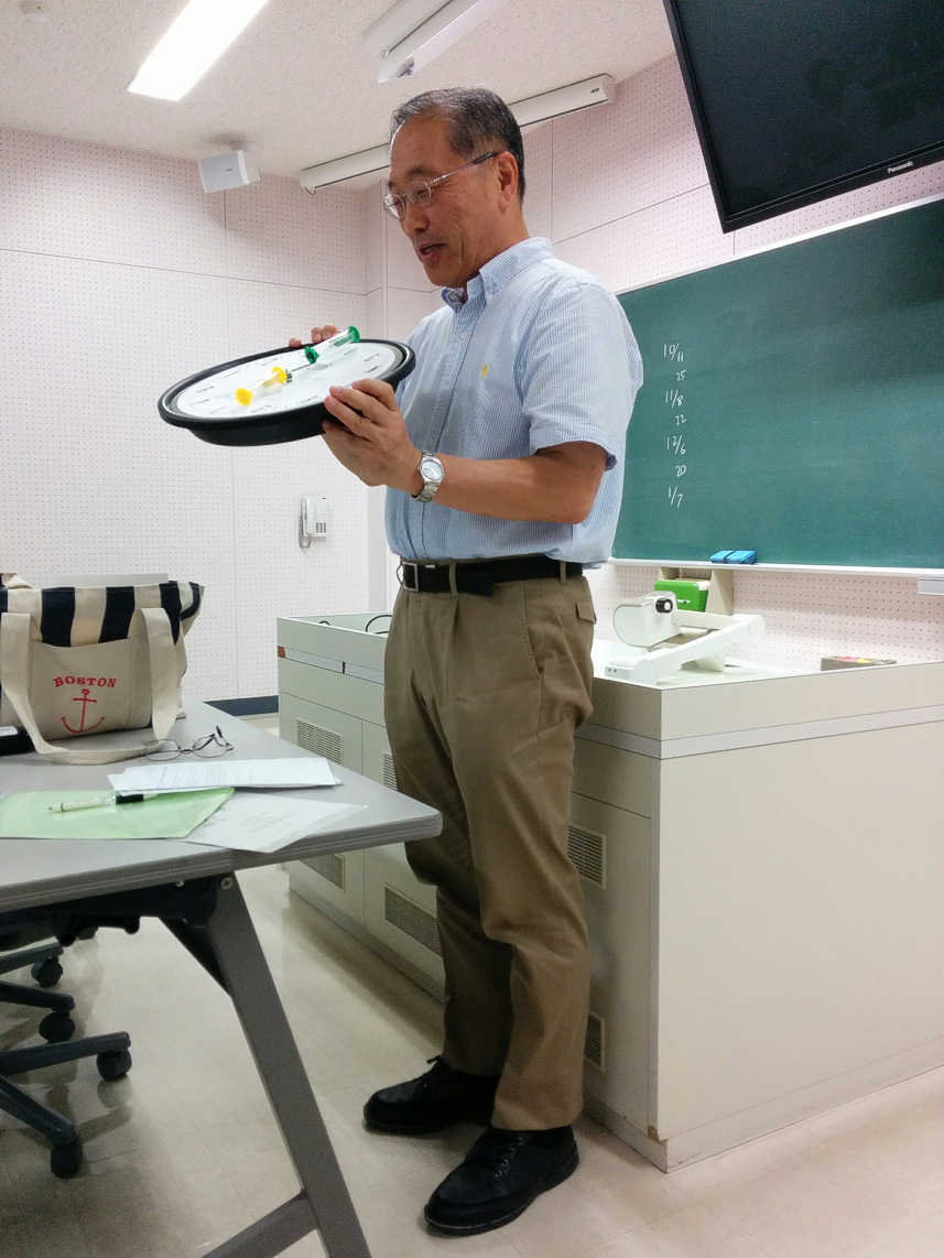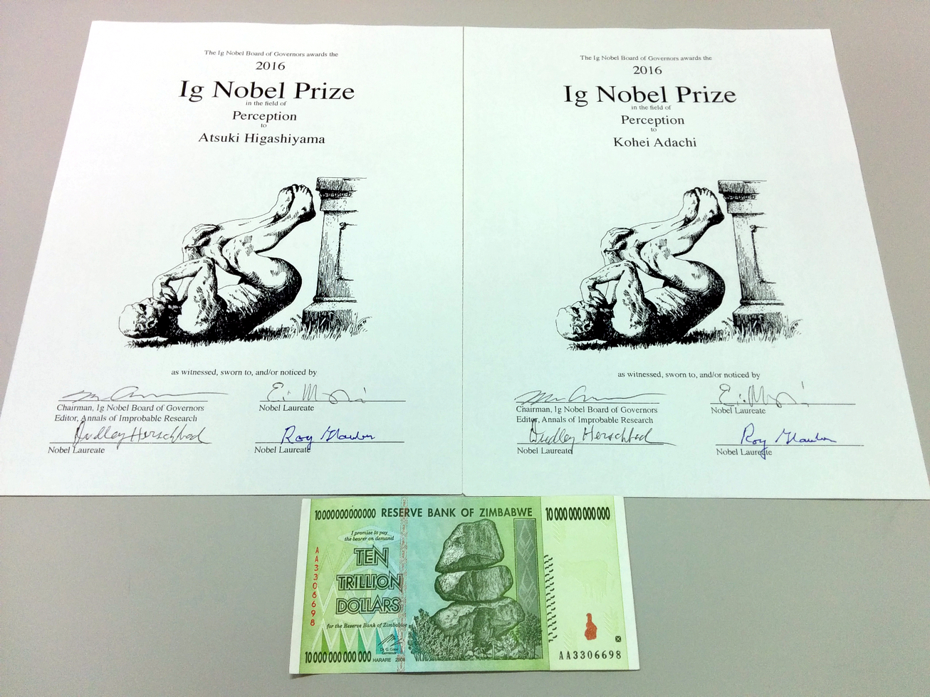Professor Atsuki Higashiyama, one of the 2016 Ig Nobel Perception Prize winners, talked in a graduate school class. He gained ten trillion Zimbabwe dollars!