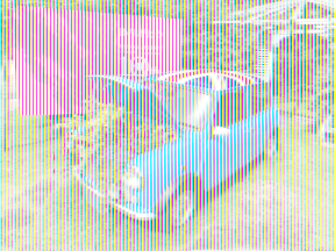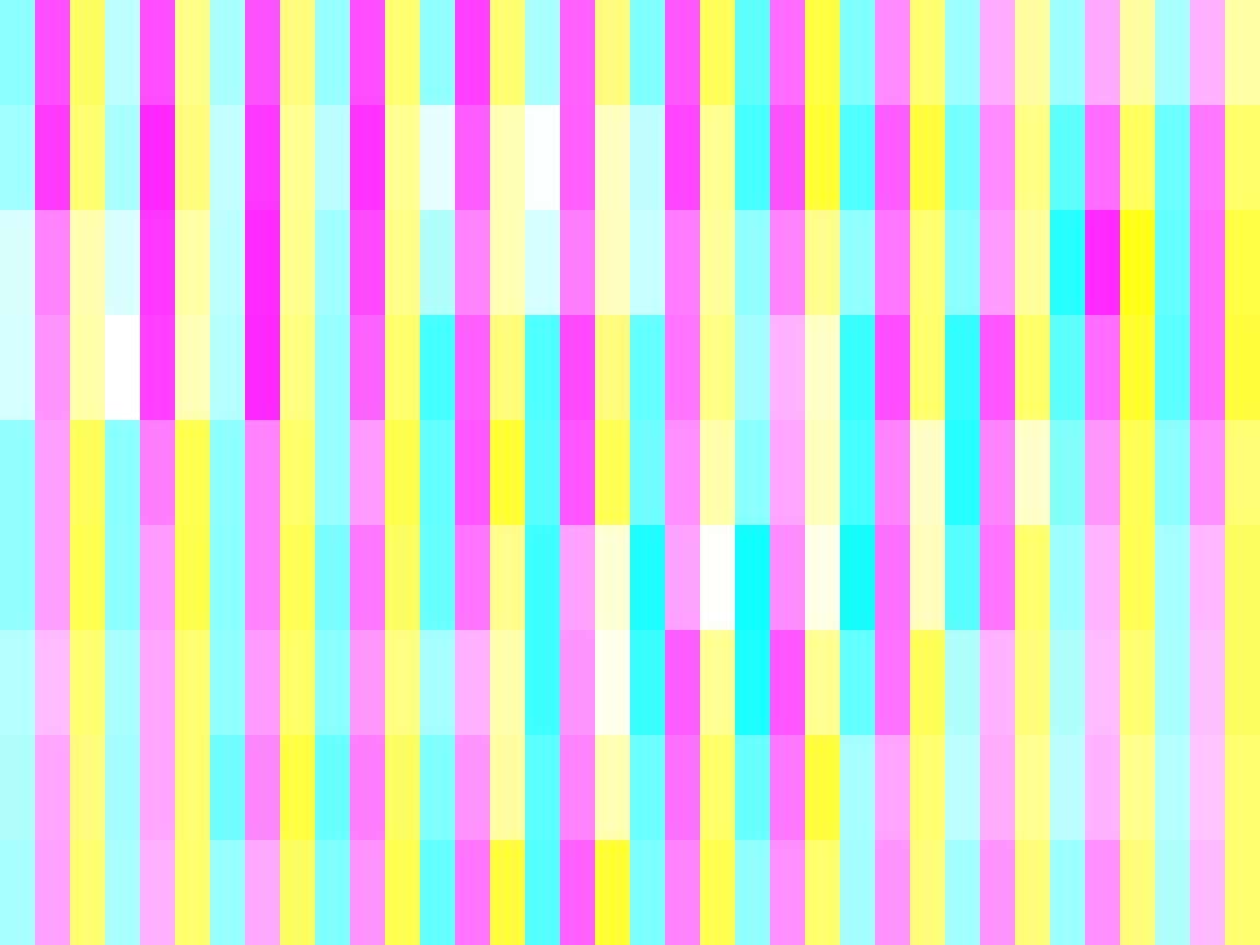 上図のRのサブピクセルに100%のシアン色(GとBそれぞれ100%)を、Gのサブピクセルに100%のマゼンタ色(RとBそれぞれ100%)を、Bのサブピクセルに100%の黄色(RとGそれぞれ100%)を加法混色した画像。「CMYを原色とした減法混色の画像」と言いたくなる並置混色画像である。