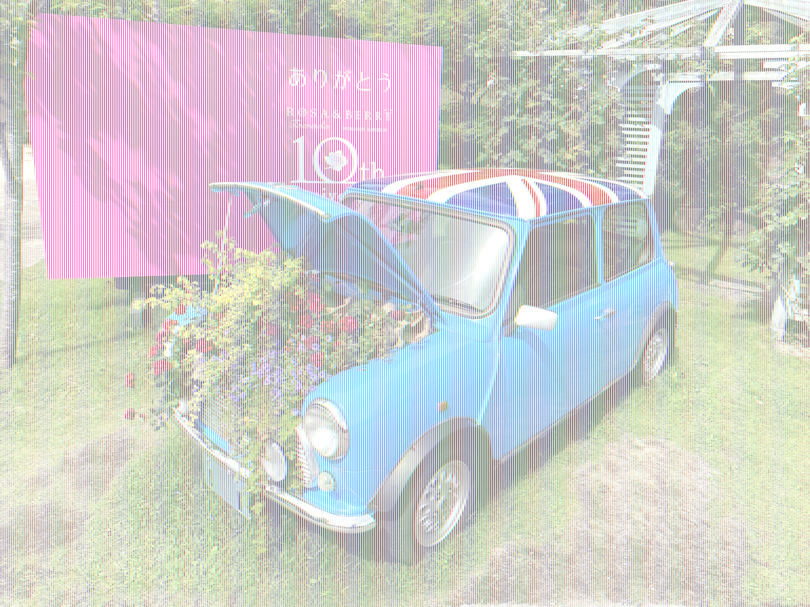 上図のRのサブピクセルに100%のシアン色(GとBそれぞれ100%)を、GとBの混色のサブピクセルに100%のRを加法混色した画像。