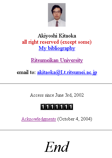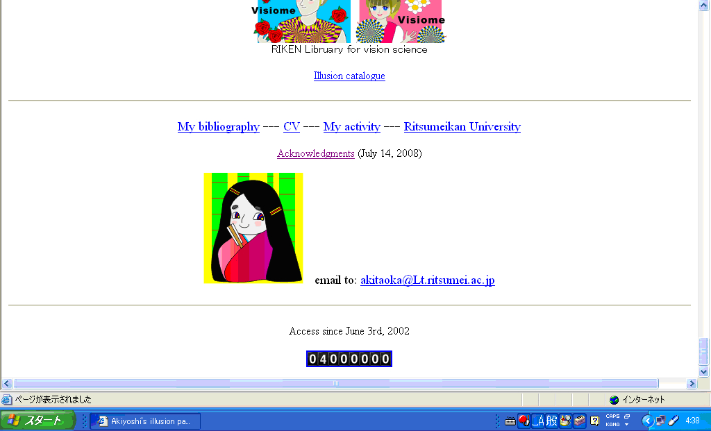 2005年6月21日 100万件目のアクセスをされた方から画像が来ました。50万件目の方と同じです。おめでとうございます。並々ならぬ苦労があったと思います。お礼に今年の東大の錯覚展にご招待(交通費・宿泊費等は自弁、ランチくらいはおごるぞ)。