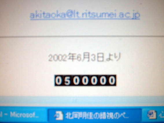 2004年10月4日 突然英語版にアクセスが殺到。10月2日12時25分に937620件であったのに、10月4日16時40分に997308件と6万件増えた。どこかの英語の有力サイトがリンクしたらしい。立命館大学のネットの状態を悪化させないよう、トップページの画像をサムネイル画像にすべて変更した(日本語版はそのまま)。17時10分、アクセス数が100万件を超えた。私自身で100万のキリ番をゲットした。しかし、指が滑って、1つカウンター進めてしまったのが下の画像である。18時10分現在、1005249件である。一体、どこのサイトに紹介されたのやら・・・