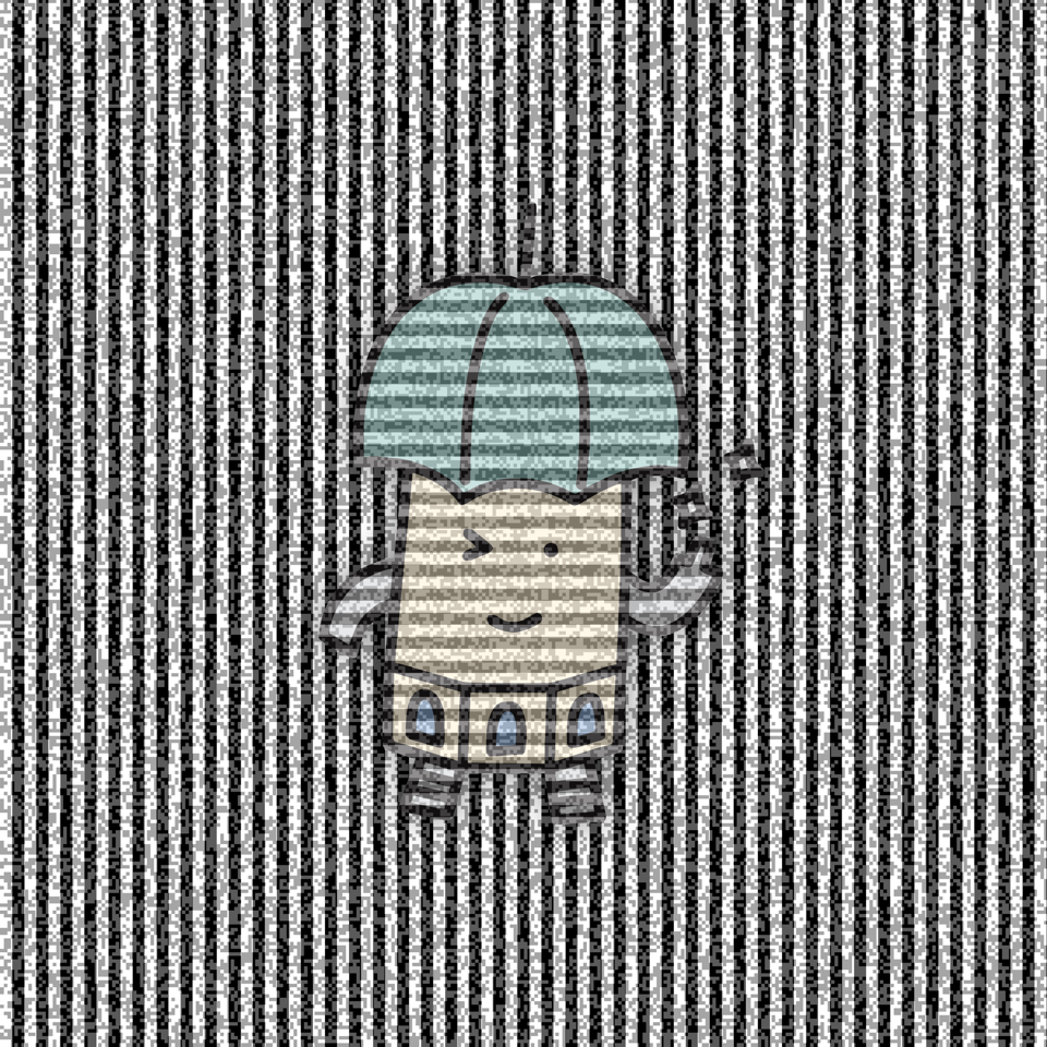 上列は、左から目の色は、赤、黄、緑、下列は、左から水色、青、赤紫に見えるが、すべて黒と白の縞模様である。