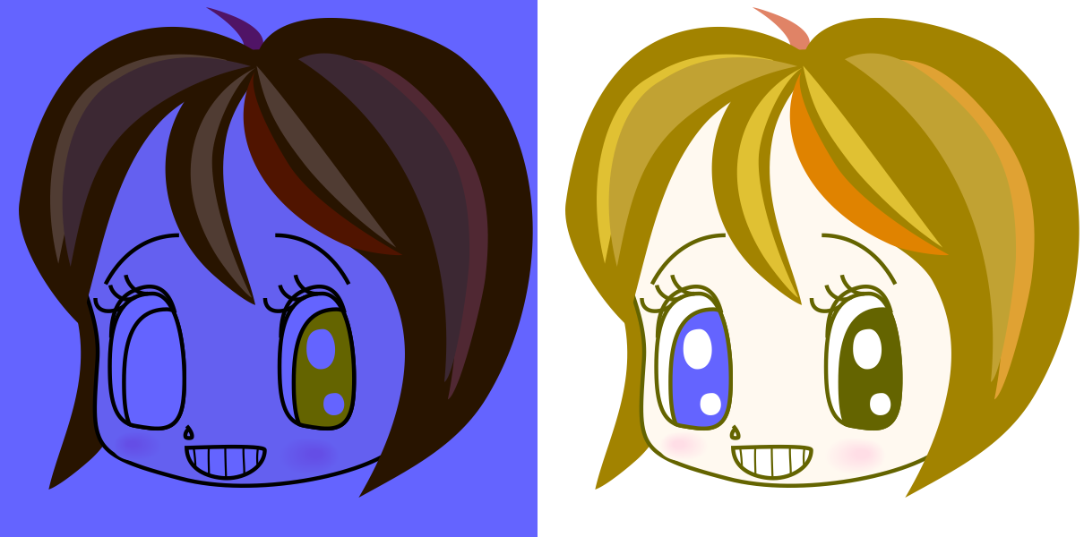 左の画像では白い目と黄色い目、右の画像では青い目と黒い目に見えるが、白い目と青い目は同じ色(R100, G100, B255)で、黄色い目と黒い目は同じ色(R100, G100, B0)である。