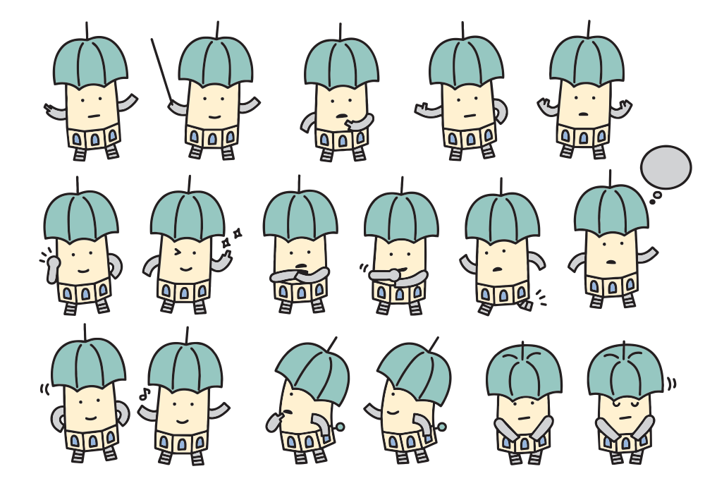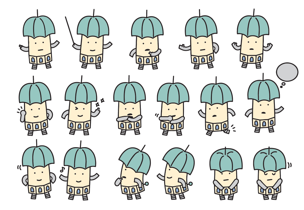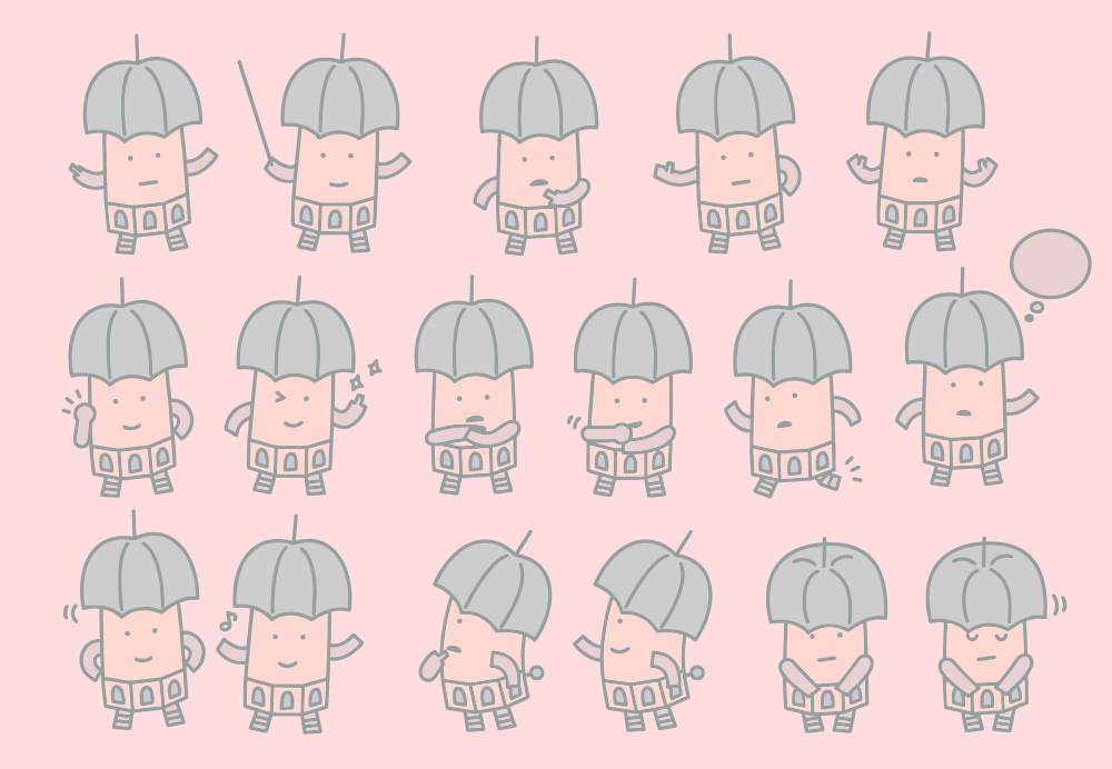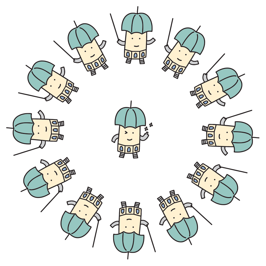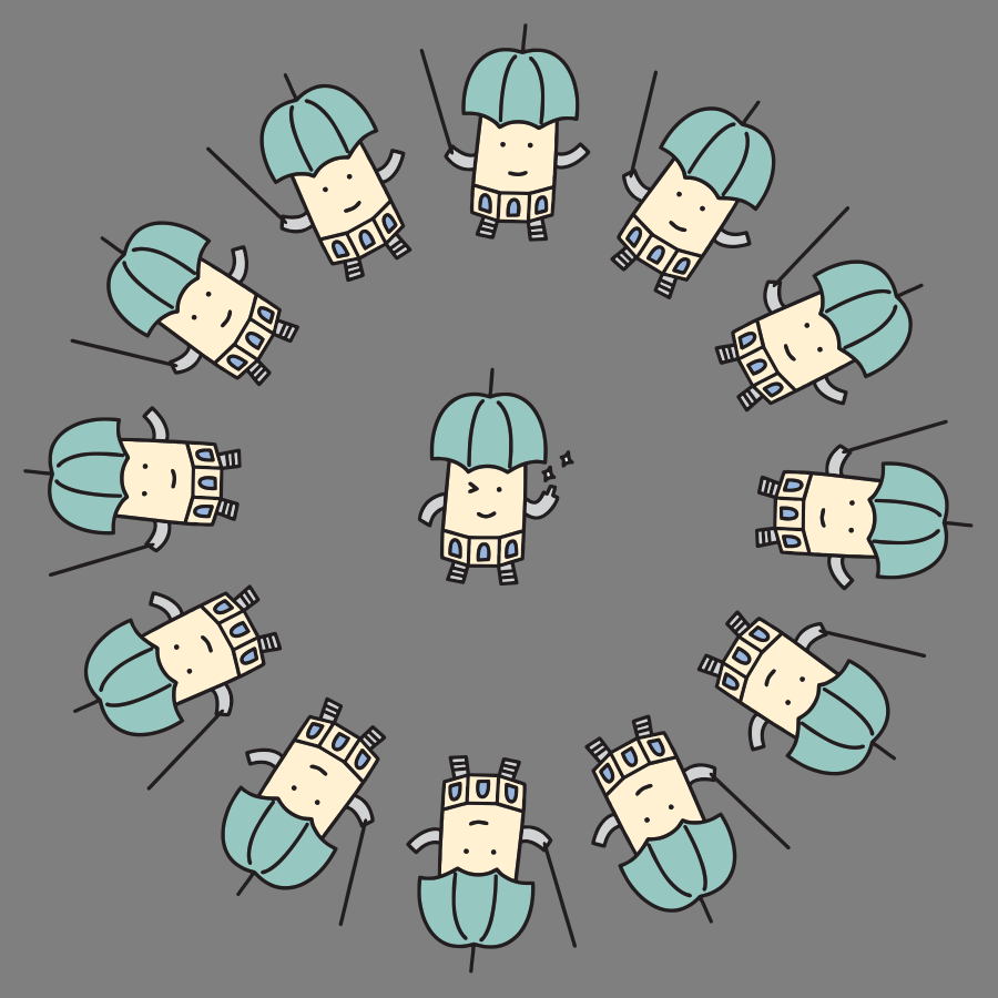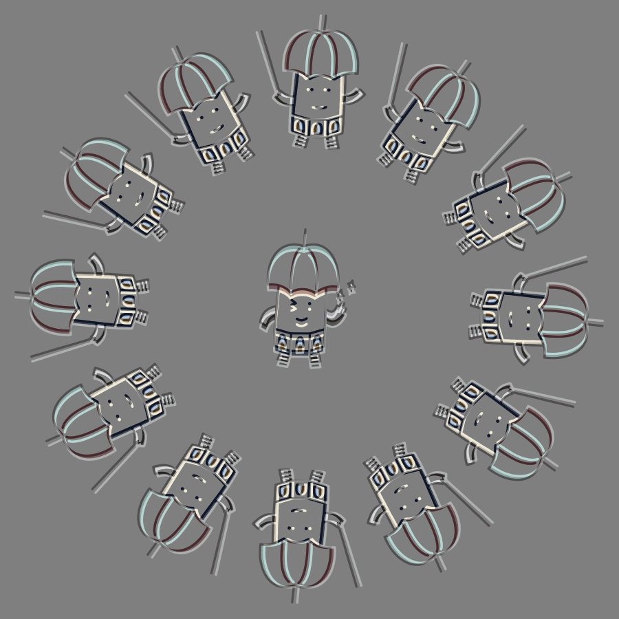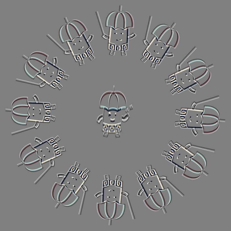 動きとして次のフレームとなる画像を用意します。リングは少し時計回りに回転した位置に描かれています。真ん中のりゅうちぃは少し上の位置にあります。