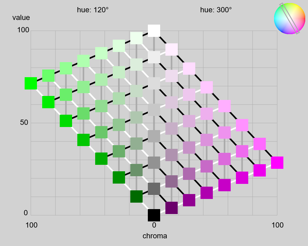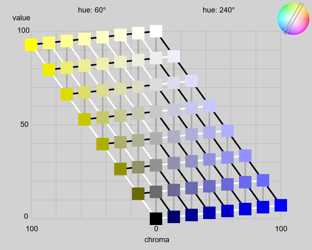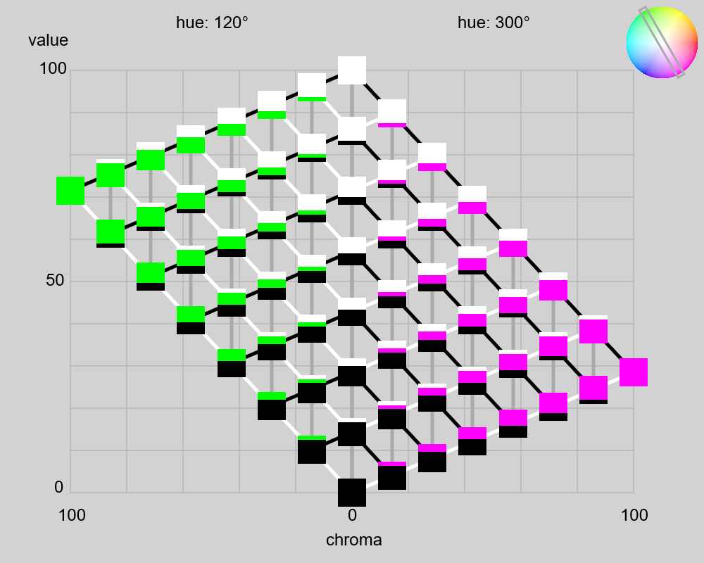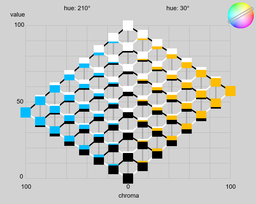 オストワルト表色系の図を作成した。ただし、縦軸(value)はsRGBの輝度×100なので、色相によって三角形の形状は異なる(この点、オリジナルのオストワルト表色系とは異なる)。斜めの黒い太線は等黒系列(isotone)、斜めの白い太線は等白系列(isotint)、垂直の灰色の太線は等純系列(isochrome)を示す。ここで、純色量(C)あるいは彩度(chroma)は、max(R_linear, G_linear, B_Linear) - min(R_linear, G_linear, B_Linear) とした。白色量(W)は min(R_linear, G_linear, B_Linear)、黒色量(B)は 1 - max(R_linear, G_linear, B_Linear) とした。ある色の純色量、白色量、黒色量の和は 1 となる(ように設計してある)。