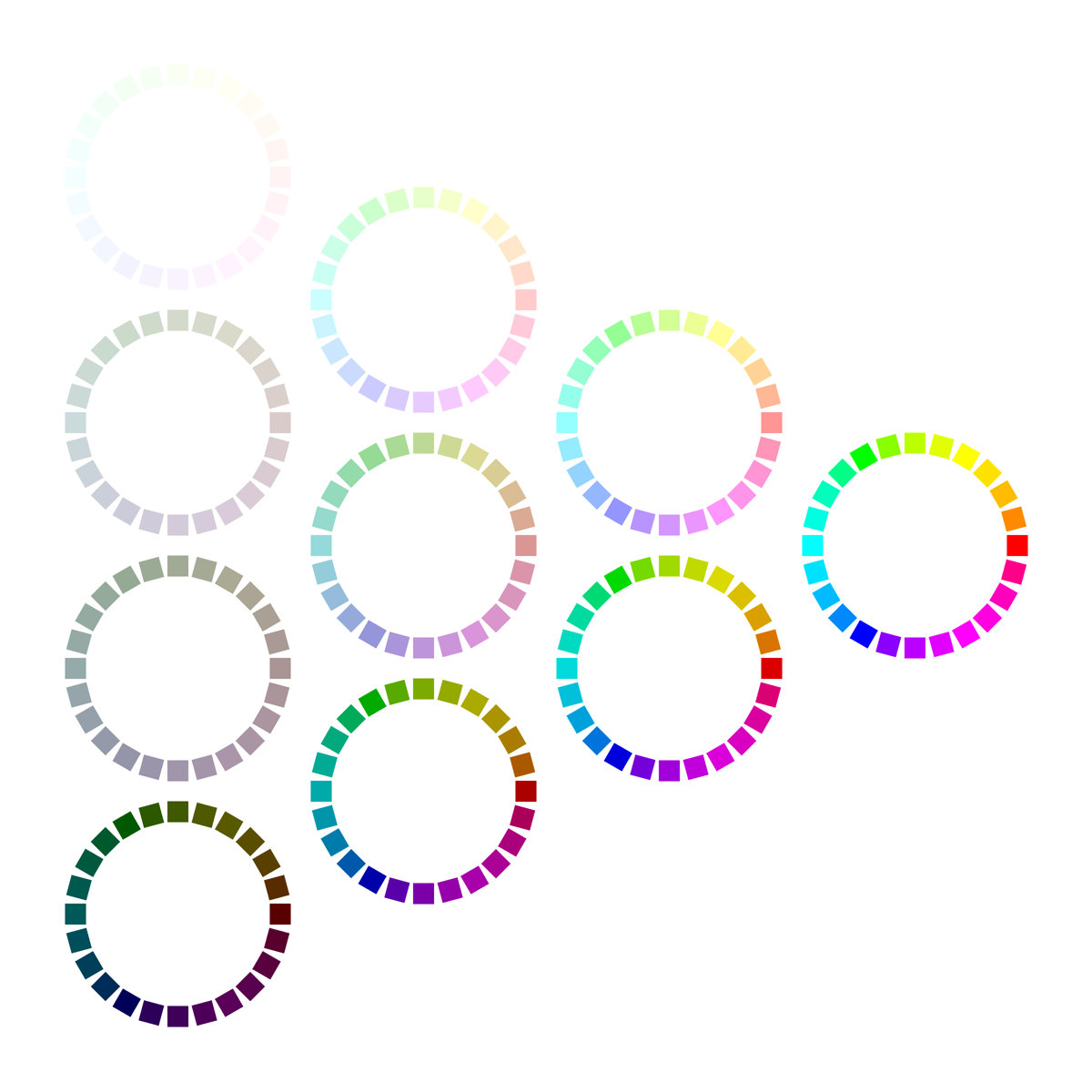sRGBオストワルト表色系における等価値色系列(isovalents)の色相環。左上のリングは、黒色量0、白色量90、純色量10(以下、合計を100とする)。その下は、黒色量30、白色量60、純色量10。さらにその下は、黒色量60、白色量30、純色量10。さらにその下(左下)は、黒色量90、白色量0、純色量10。左から2番目のコラムの一番上は、黒色量0、白色量60、純色量40。その下は、黒色量30、白色量30、純色量40。さらにその下(左から2番目のコラムの一番下)は、黒色量60、白色量0、純色量40。右から2番目のコラムの一番上は、黒色量0、白色量30、純色量70。その下(右から2番目のコラムの一番下)は、黒色量30、白色量0、純色量70。右のリングは、黒色量0、白色量0、純色量100。