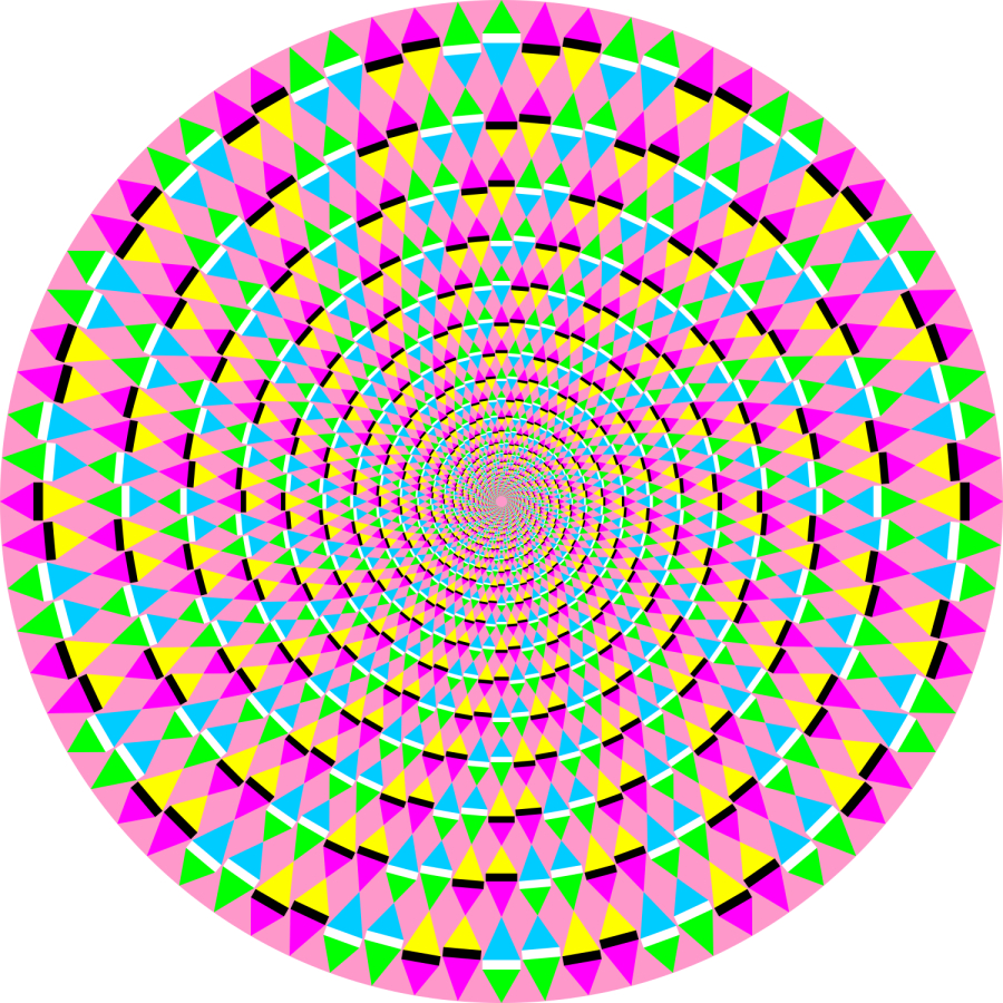 In each image, concentric circles appear to be spirals (a spiral). There is a difference in the direction of spiral. The upper two images show spirals that approach the center by rotating clockwise (the spiral illusion of the Zöllner illusion), while the lower one display spirals that approach the center by rotating counterclockwise (the spiral illusion of the Fraser illusion). All images are made of oblique segments of the same orientation when seen from the center.