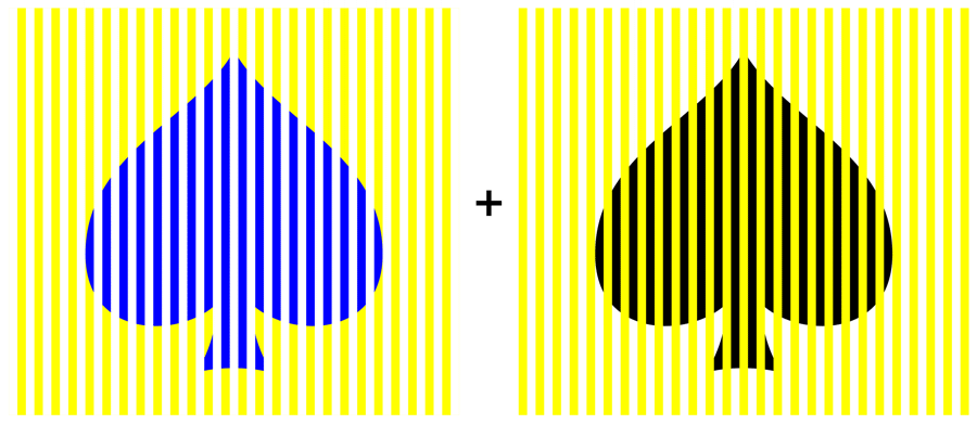 The left spade is constantly blue and the right one is black, but the reversal is observed for one second per six seconds when observers fix their eyes on the cross.