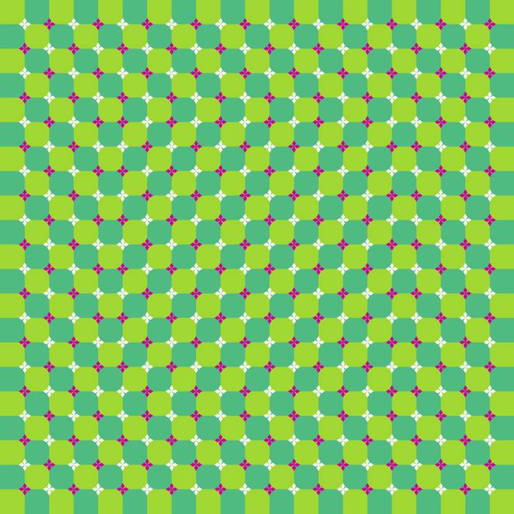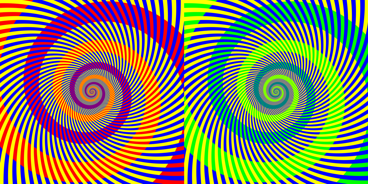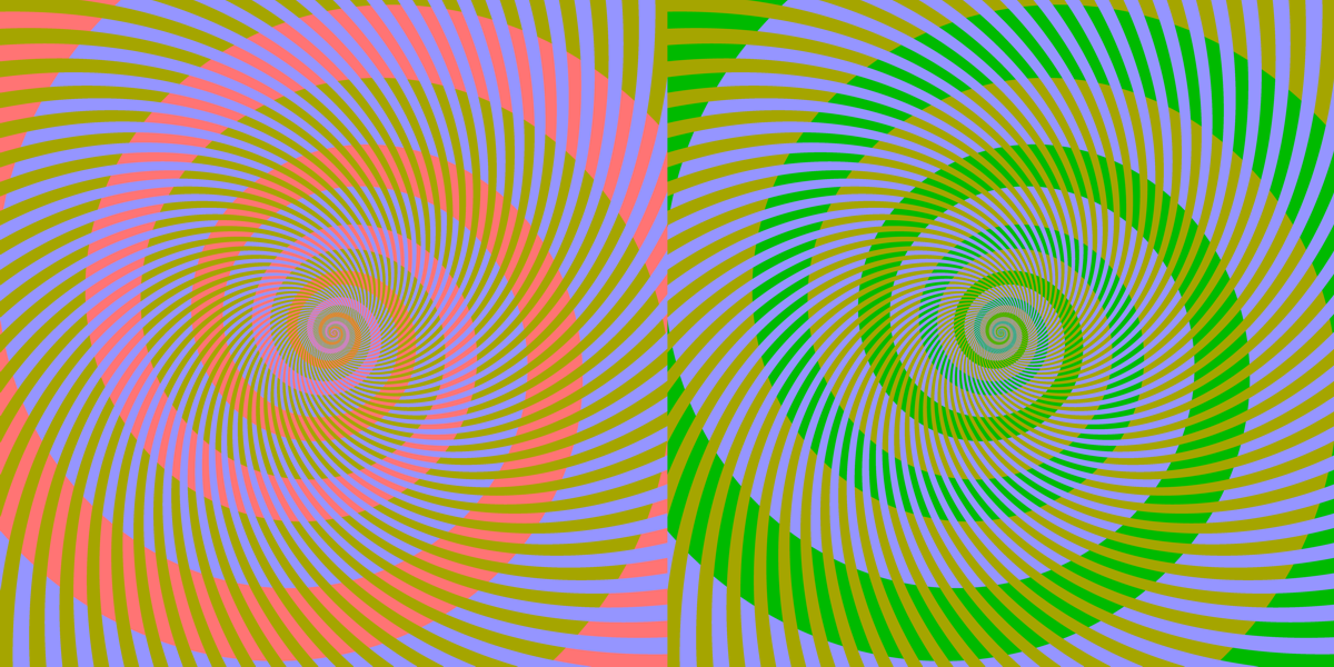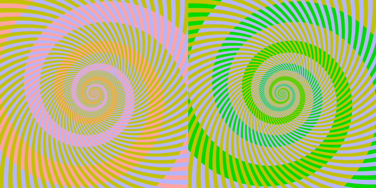 左半分においては、オレンジ色の渦巻きとピンク色の渦巻きがあるように見えるが、両者は同じ色である。右半分においては、黄緑色の渦巻きと水色の渦巻きがあるように見えるが、両者は同じ色である。