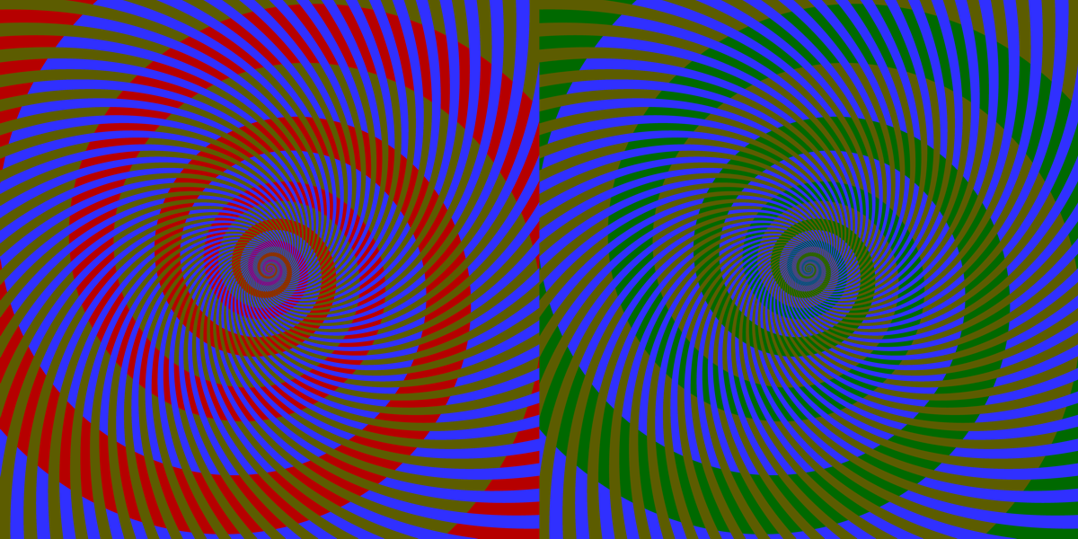 「sRGB上の等輝度(Y = 0.100)の赤の渦巻きと緑の渦巻き」