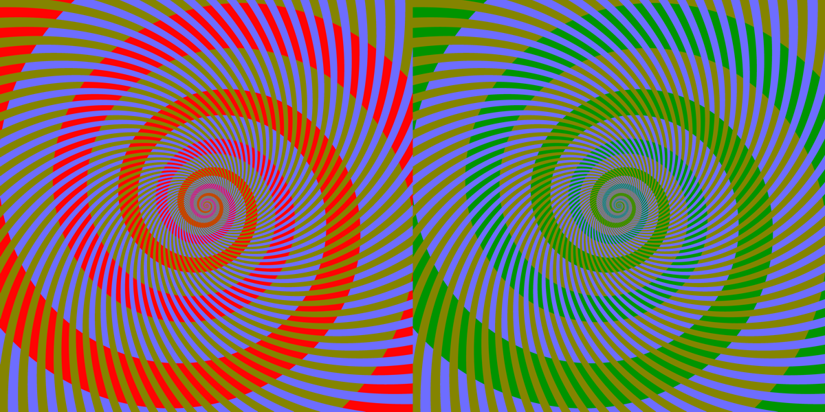 「sRGB上の等輝度(Y = 0.213)の赤の渦巻きと緑の渦巻き」