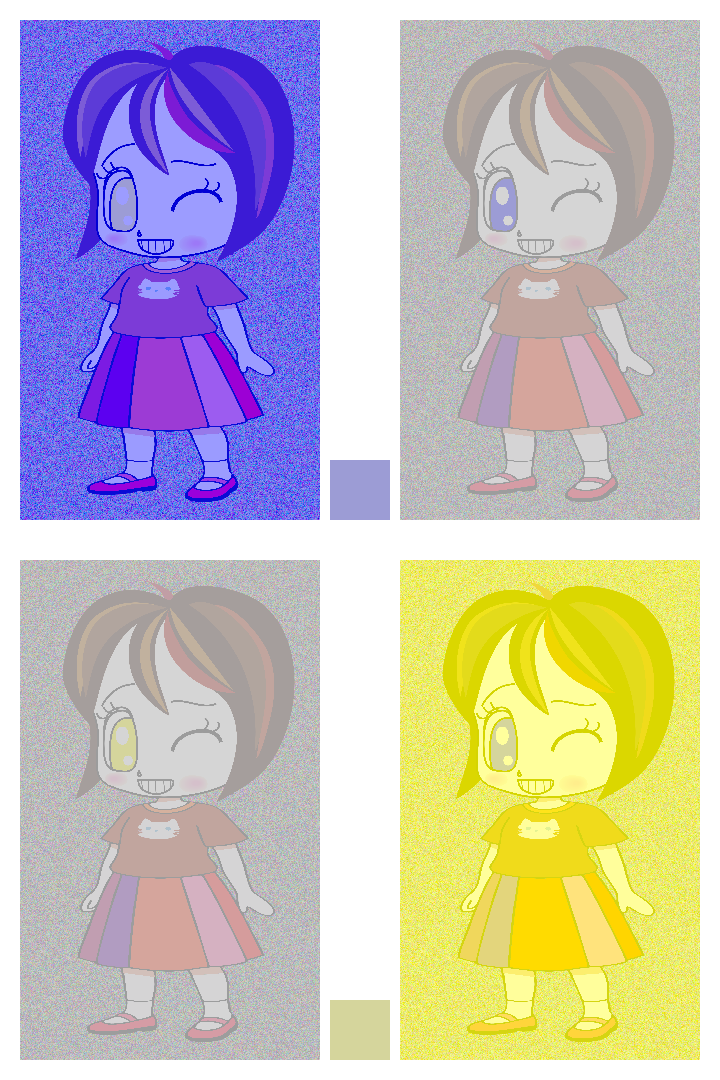 左上の画像の目は黄色く見えるが、画素は右上の画像の目と同じ青色である。それは、左右の画像の間に置かれた正方形の青色と同じ色である。一方、右下の画像の目は青色に見えるが、画素は左下の画像の目と同じ黄色である。それは、左右の画像の間に置かれた正方形の黄色の色と同じ色である。