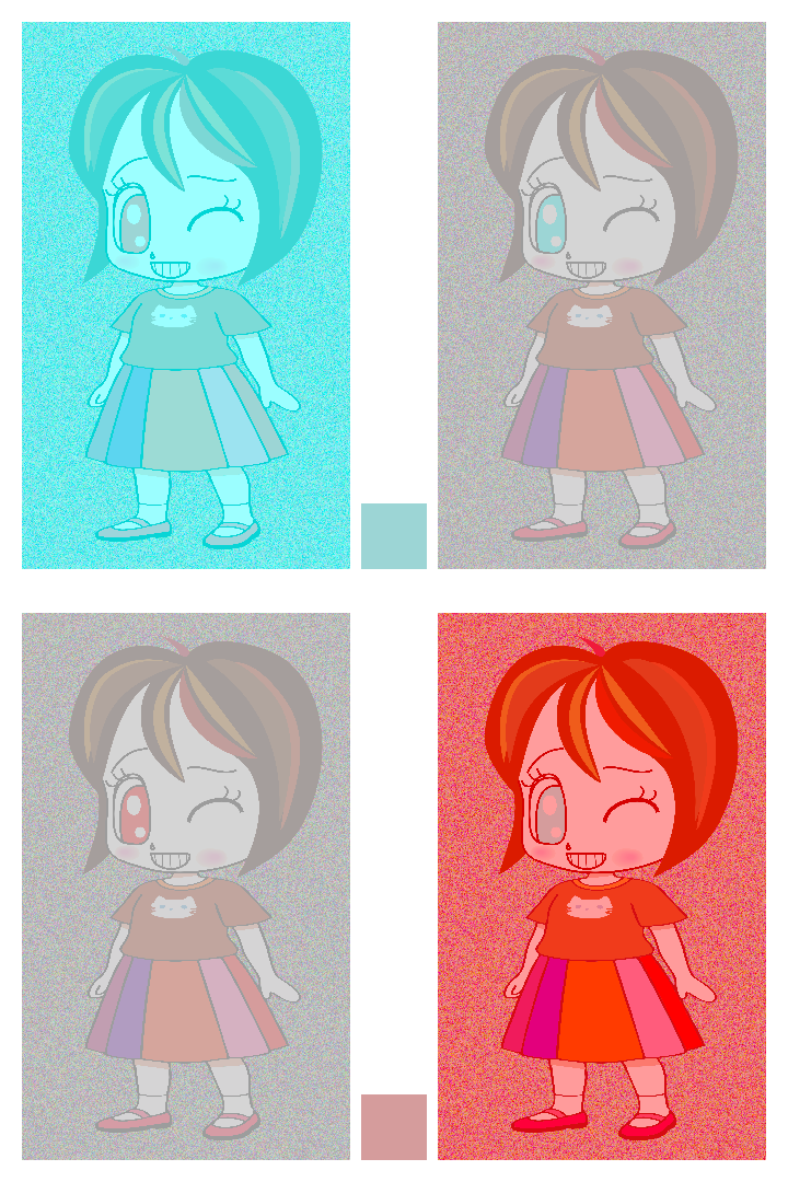 左上の画像の目は赤く見えるが、画素は右上の画像の目と同じ水色(シアン色)である。それは、左右の画像の間に置かれた正方形のシアン色と同じ色である。一方、右下の画像の目は水色に見えるが、画素は左下の画像の目と同じ赤色である。それは、左右の画像の間に置かれた正方形の赤みのある色と同じ色である。