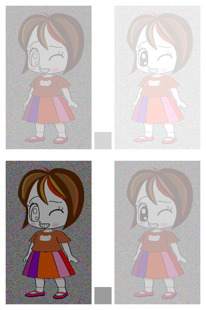 左上の画像の目は白く見えるが、画素は右上の画像の黒く見える目と同じ灰色である。それは、左右の画像の間に置かれた正方形の灰色と同じ色である。同様に、左下の画像の目は白く見えるが、画素は右下の画像の黒く見える目と同じ灰色である。それは、左右の画像の間に置かれた正方形の灰色と同じ色である。