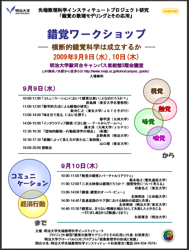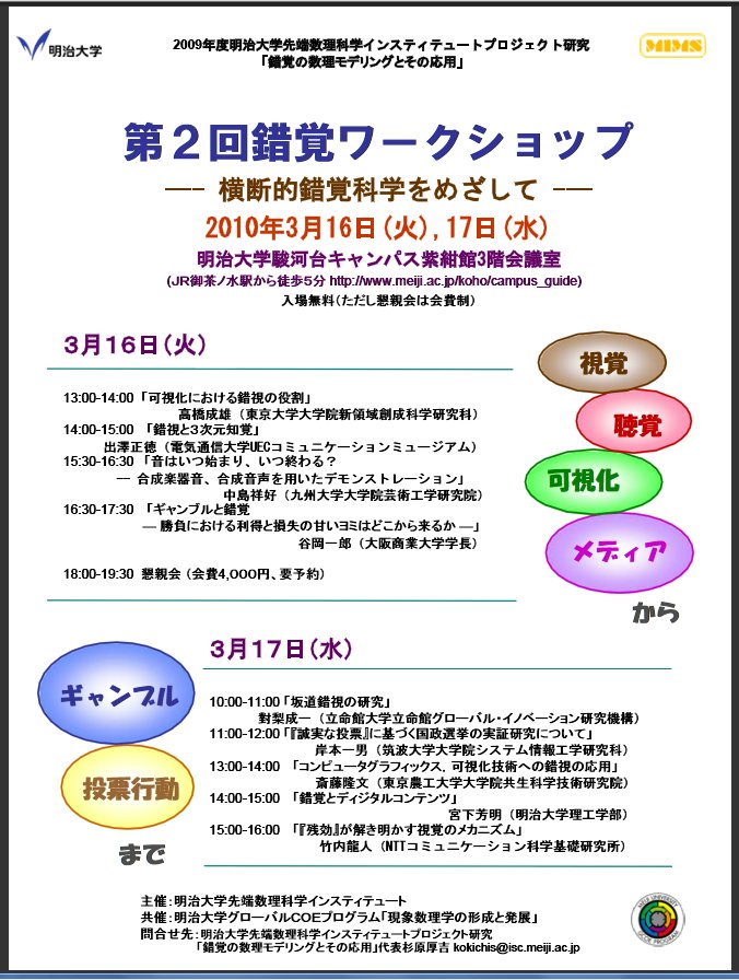 横断的錯覚科学は成立するか」・明治大学先端数理科学インスティテュート・プロジェクト研究「錯覚の数理モデリングとその応用」主催 明治大学駿河台キャンパス紫紺館3階会議室・2009年9月10日(木)発表) 発表に使用したウェブページ
