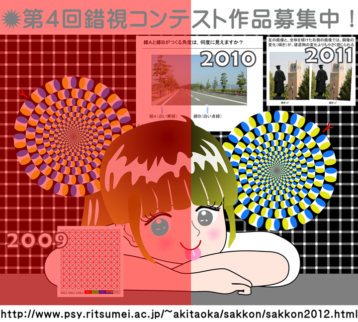 概要: 日本基礎心理学会第31回大会(九州大学)の開催に合わせまして、第4回錯視コンテストを実施いたします。錯視をモチーフとした力作・珍作・大作を、学会員だけではなく一般の方からも広く募集いたします。今回の錯視コンテストの受賞作品の紹介および授賞式は2012年11月3日の第31回日本基礎心理学会における懇親会にて実施の予定です。トップ10の作品には、視覚刺激の「国立電子図書館」であるVisiome Platformに登録することをお手伝い致します。