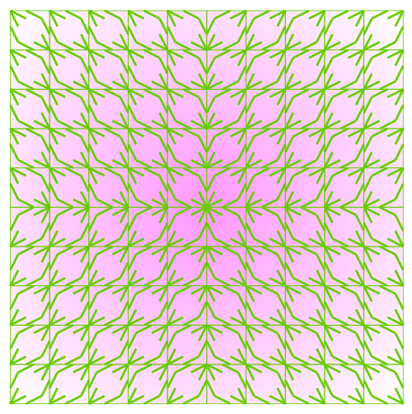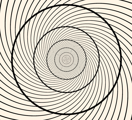黒い太線は同心円であるが、右に回って中心に向かう渦巻きのように見える。